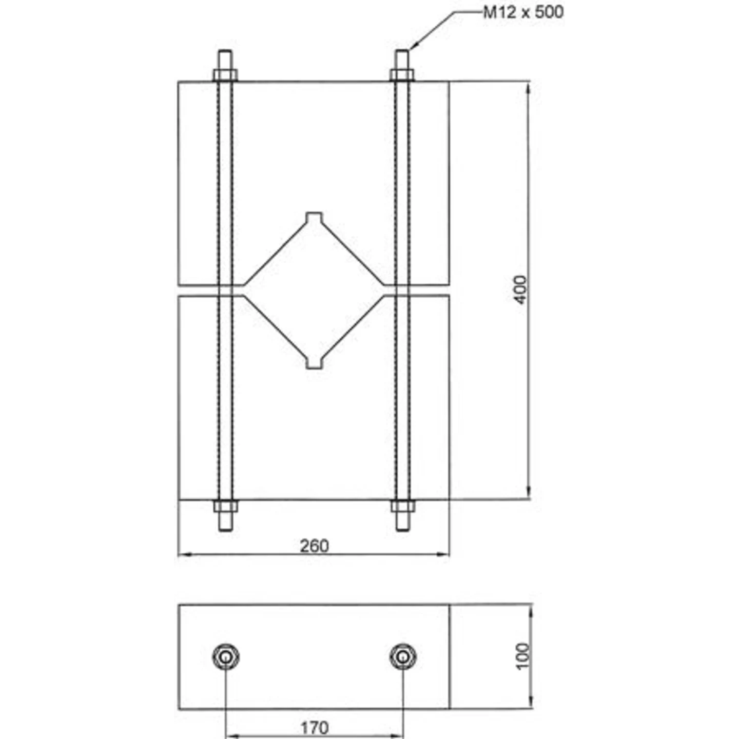 Betonplade fundament for Ø100-140mm mast. Sæt med betonplader(260x200x110 2Stk) 22kg ,gevindstænger,skiver (M12x500) og møtrikker