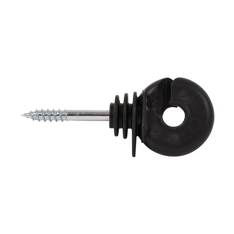 Ringisolator med kontinuerlig støtte til træpæl. Fremstillet af sort kvalitetsplast. Egnet til tråd og reb.