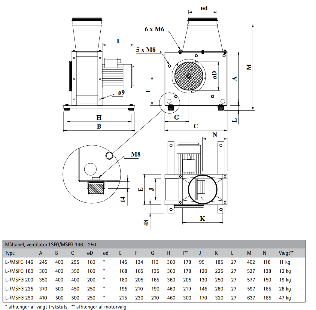 Ventilator dimension: 146 mm, 180 mm, 200 mm, 225 mm, 250 mm, 315 mm, 355 mm, 400 mm, 450 mm, 500 mm, 560 mm, 630 mm, 800 mm, 900 mm, 1000 mm