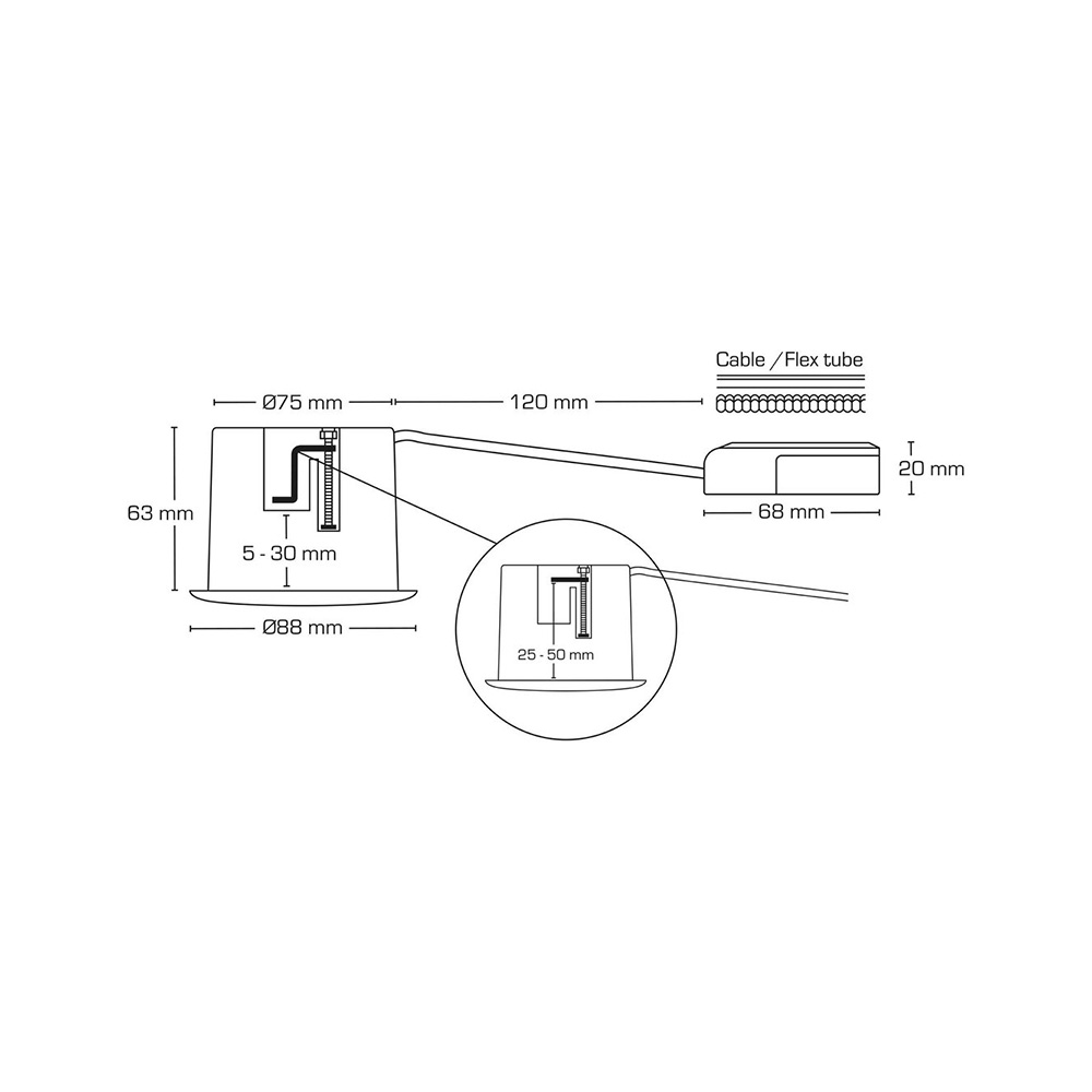 Luna Quick install 2.0 er en kipbar downlight med bagmonteret lyskilde, godkendt til direkte indbygning i isolering og brændbart materiale. Den smarte tilslutningsboks med en højde på kun 20 mm er forberedt for installation med kabel eller flexrør. De nye klemmer gør tilslutningen til en leg uden ømme fingre. Luna Quick install 2.0 fastgøres vha. skruer og er også velegnet til akustiklofter. Indbygningshøjden på kun 63 mm, sikrer mange anvendelsesmuligheder. Leveres inkl. dæmpbar 5W GU10 LED lyskilde. Luna Quick install 2.0 er IP44 og egnet for både indendørs- og udendørs montering samt direkte i isolering.