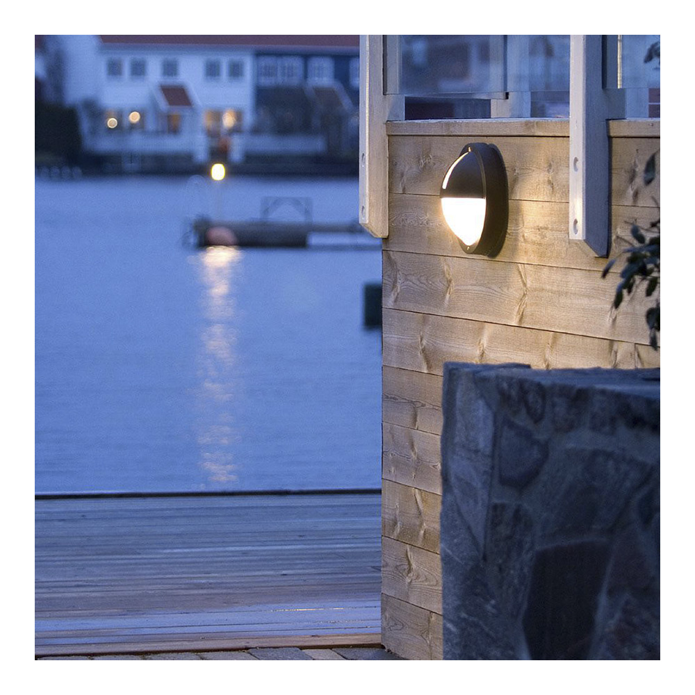 Rundt flot væg armatur med halvafskærmning og kryds som både kan monteres ude og inde. Udført i trykstøbt pulverlakeret aluminium. Skærm i UV stabiliseret opal polycarbonat. 2 ind/udgange for kabler, mulighed for både synlig og skjult kabling samt sløjfbare hurtig klemmer. Korrosionsbeskyttet med 10 års garanti, IP65 og vandal klasse IK10.