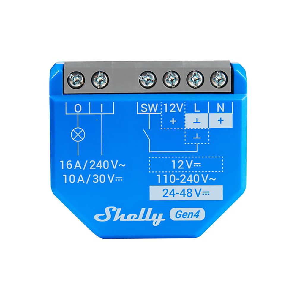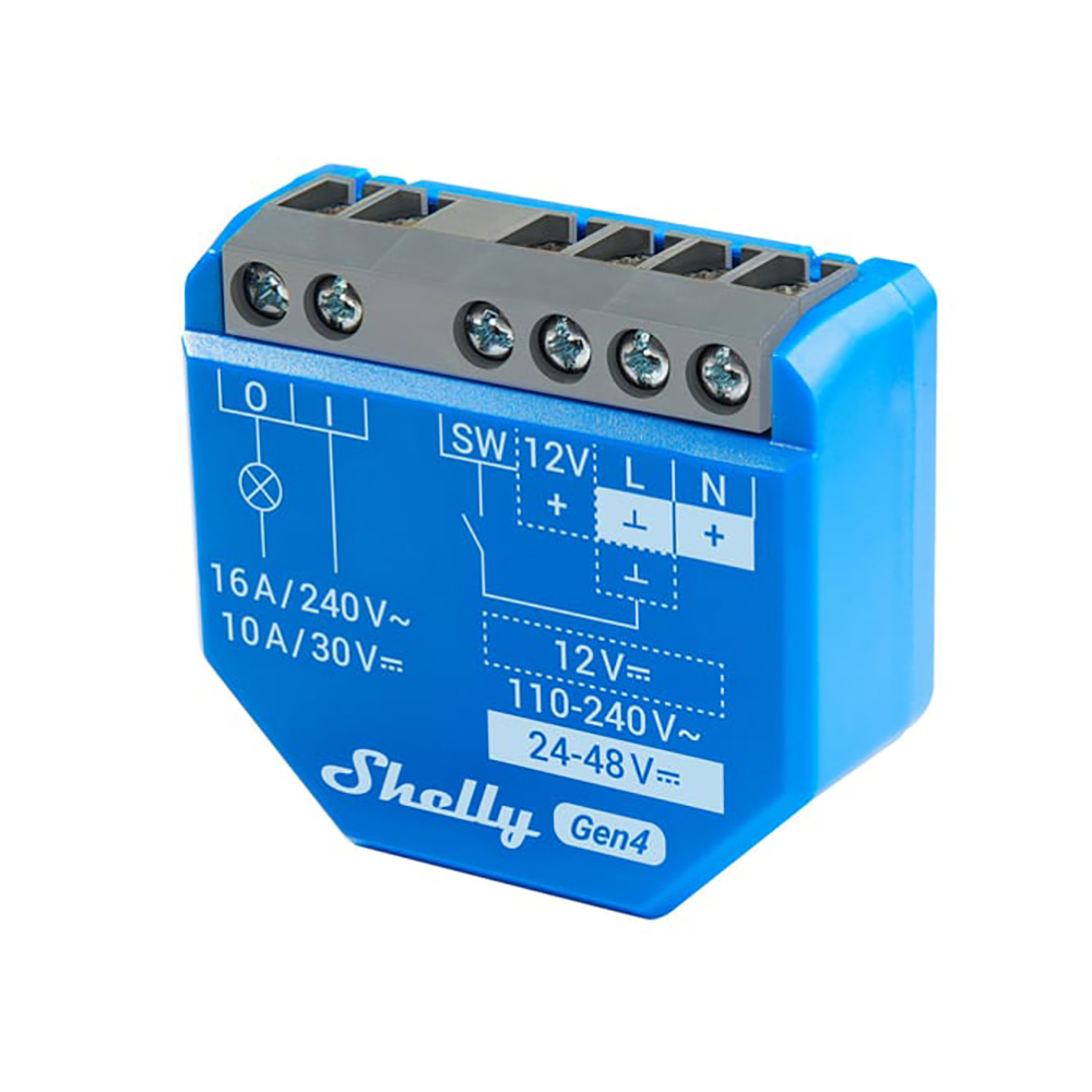 Shelly 1 Gen4 er beregnet til montering bag afbryderen, stikkontakten eller lampeudtaget og giver nem betjening og automatisering af lys, garageporte, vandingssystem, ventilatorer og lignende. Takket være det kompakte design er den nem at installere i væg- og loftsdåser.