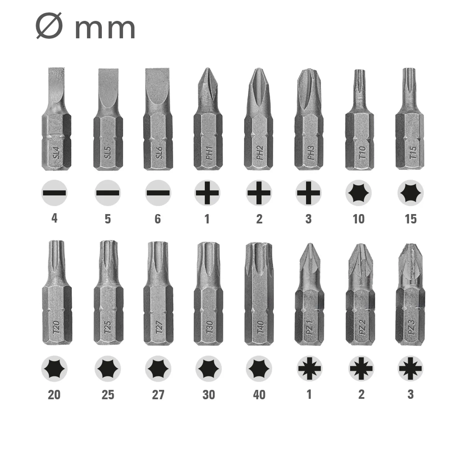 Størrelser: SL 4 / 5 / 6 | PH 1 / 2 / 3 | T 10 / 15 / 20 / 25 / 27 / 30 / 40 | PZ 1 / 2 / 3 mm