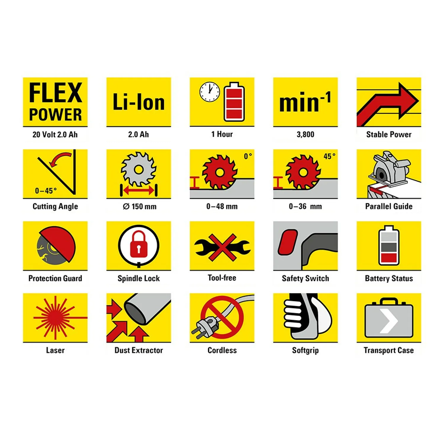Takker være 20 V stærk Lithium-Ion-Akku (2,0 Ah) uden Memory-effekt og uden selvafladning er akku-håndholdt rundsav ekstrem effektiv og yderst fleksibel at anvende. Den store fordel af dette batteri er den korte opladningstid på kun en time. Det er muligt med hurtig-opladningsenheden med en automatisk opladnings nedlukning. Det allervigtigste i det praktiske er det tretrin akku-kapacitetspanel, som er integreret i batteriet. En anden fordel er, at Flexpower-Multiakku kan kombineres fleksibelt også med andre akku-værktøjer.
