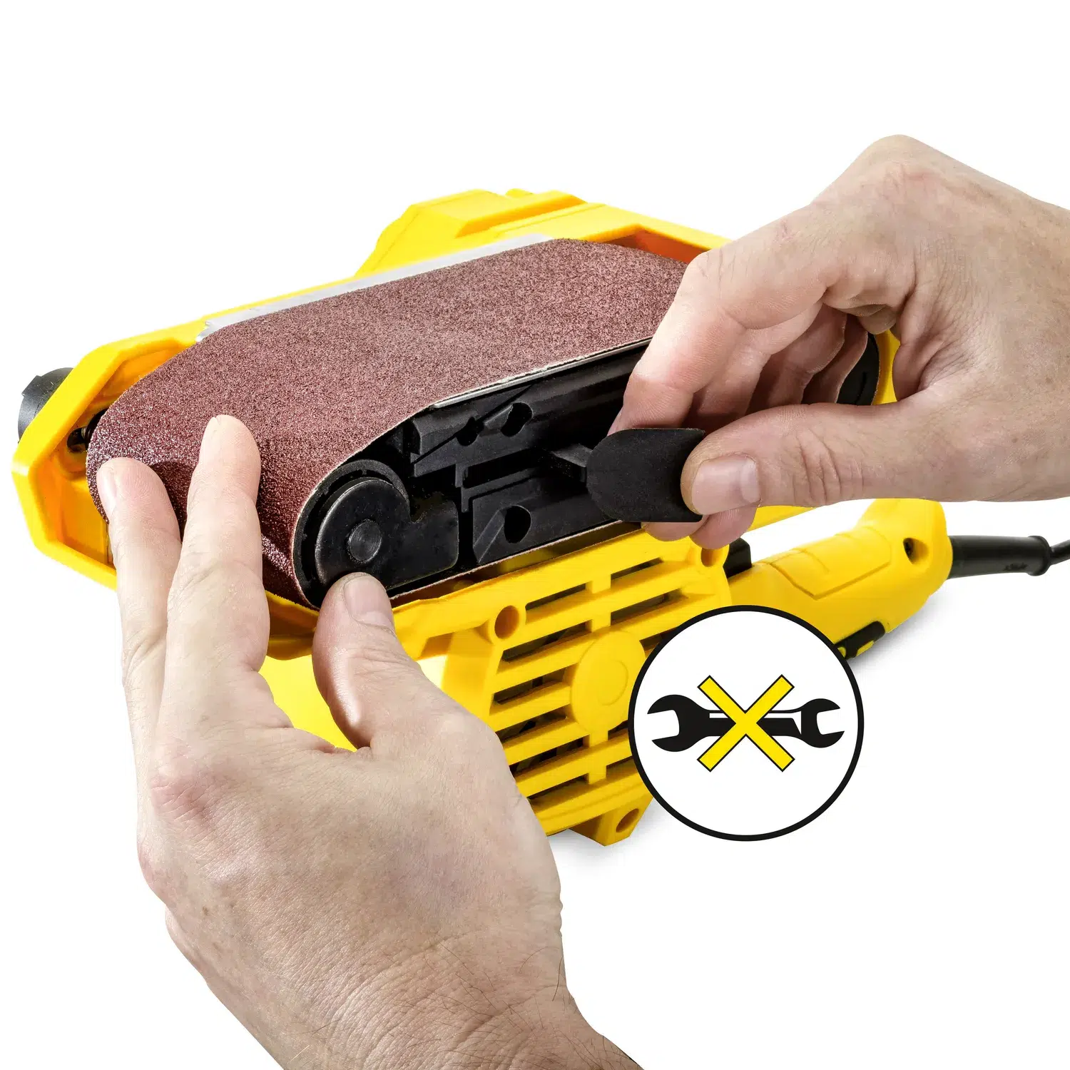 - Værktøjsfrit spændesystem til nemt skift af slibebånd