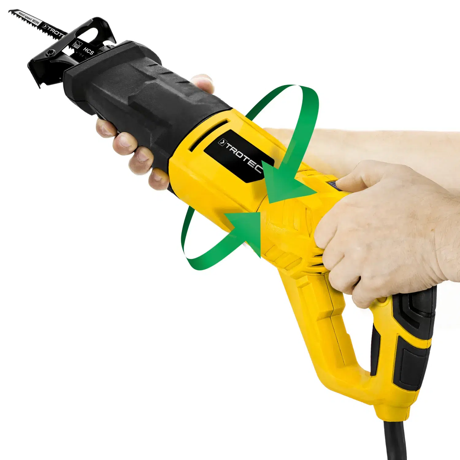 Takker være denne geniale konstruktion kan savbladet praktisk tilpasses i enhver ønsket position, og på den måde få adgang til ellers vanskelige tilskærninger, også i topskæring. Ikke kun i haven er denne funktion nyttig, men også ved tilbygninger, ombygninger, såsom renovering.