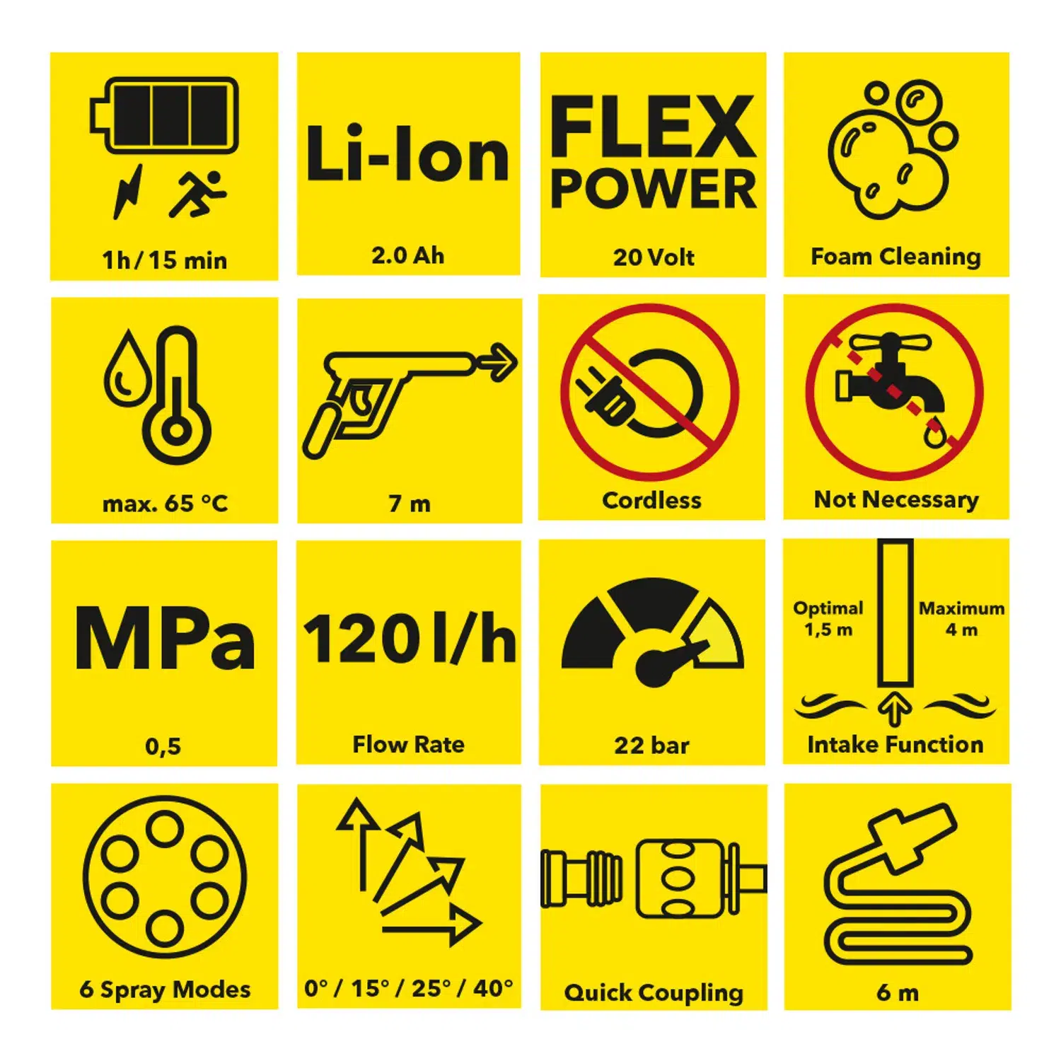Hurtigt og bekvemt skift af stråle takket være den roterende dyse. Fire stråletyper med forskellige sprøjtevinkler (0°, 15°, 25°, 40°) til fjernelse af genstridigt snavs på små og store overflader, en blid stråle (Shower) til simpelt rengøringsarbejde eller vanding og en opadrettet vandstråle (Up) til rengøring af svært tilgængelige områder.