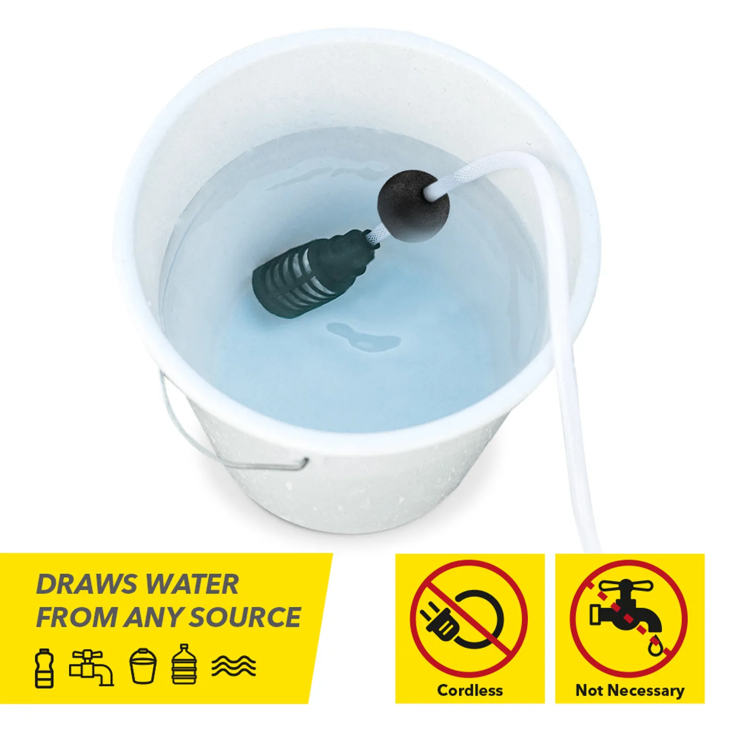 Til brug med faste vandtilslutninger eller alternative vandkilder (maks. 4 m sugehøjde). Sugeslange (6 m) med lynkobling på begge sider, integreret nylon-snavsfilter og flyder for at forhindre, at apparatet løber tør ved brug af vandbeholdere. Ideel til brug med spande, regntønder og cisterner.