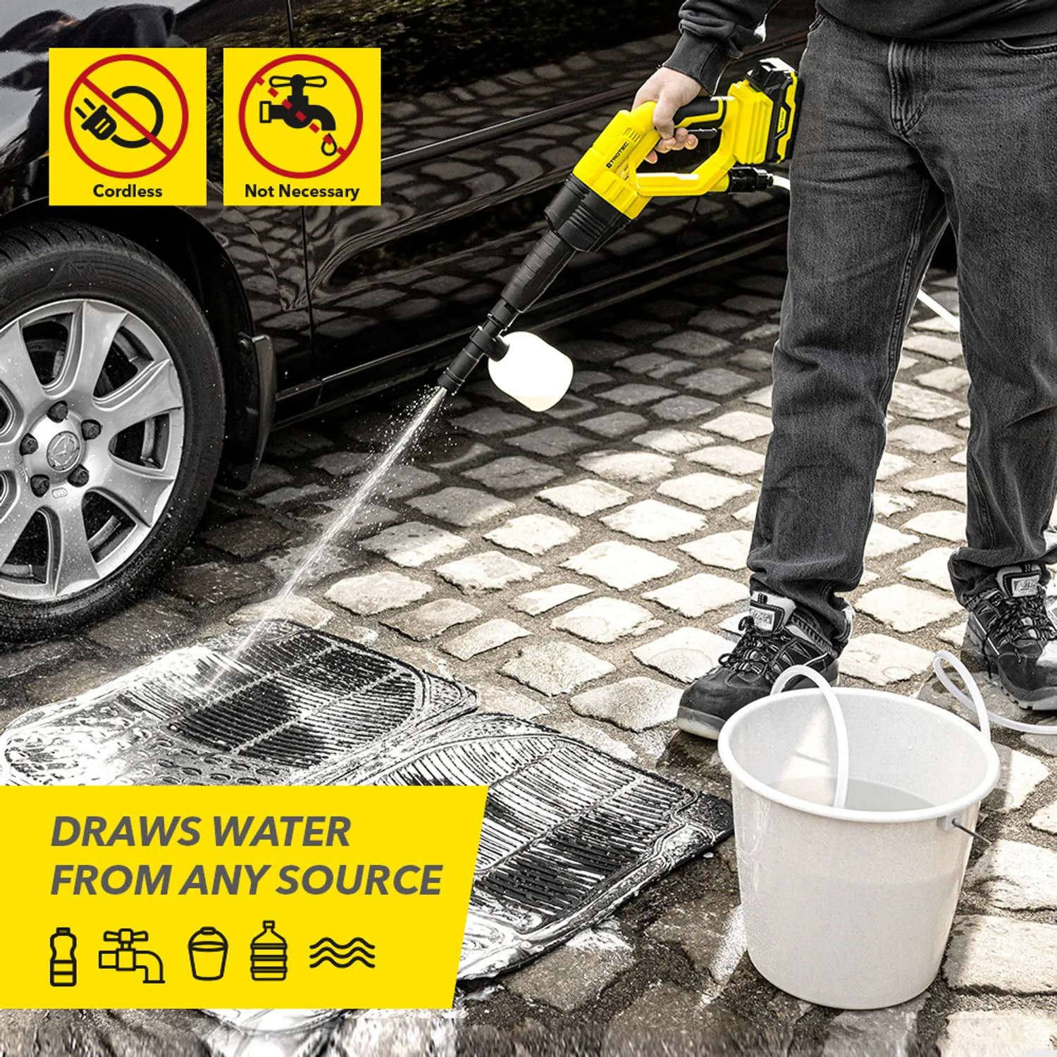 Forbedret rengøringsydelse med rengøringsmiddel. Til brug med kommercielt tilgængelige rengøringsmidler (skummende) til højtryksrensere. Ideel til rengøring af biler, fælge, cykler og motorcykler.