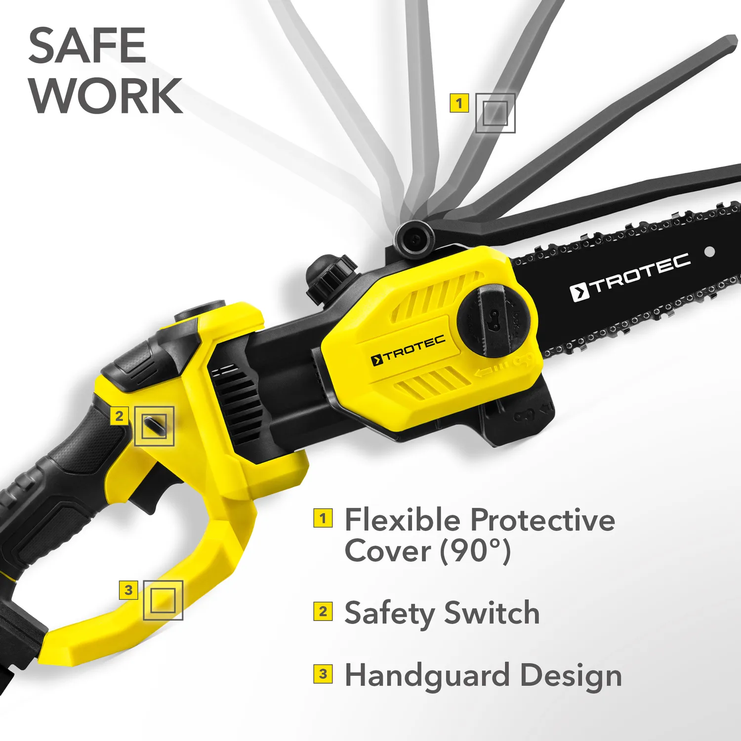 Sikkerhedfor professionelle og begyndere PCHS 10-20V kædesaven er udstyret med en række sikkerhedsanordninger til sikkert arbejde. Sikkerhedsanordninger til sikkert arbejde. For at forhindre, at den elektriske sav startes ved et uheld, er der integreret en låsbar tændingsbeskyttelse i håndtaget. integreret i håndtaget. En håndbeskyttelse integreret under håndtaget håndtaget forhindrer grene i at ramme dine hænder, når du saver. hænder, når du saver. Den batteridrevne kædesavs sikkerhedsfunktioner afrundes af et af et beskyttelsesdæksel, der kan drejes 90° og dækker oversiden af kæden i enhver savstilling. af kæden i alle savepositioner og en robust kædeskærm til sikker opbevaring og transport. for sikker opbevaring og transport.