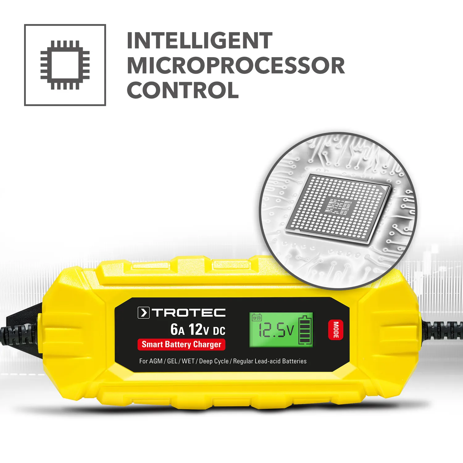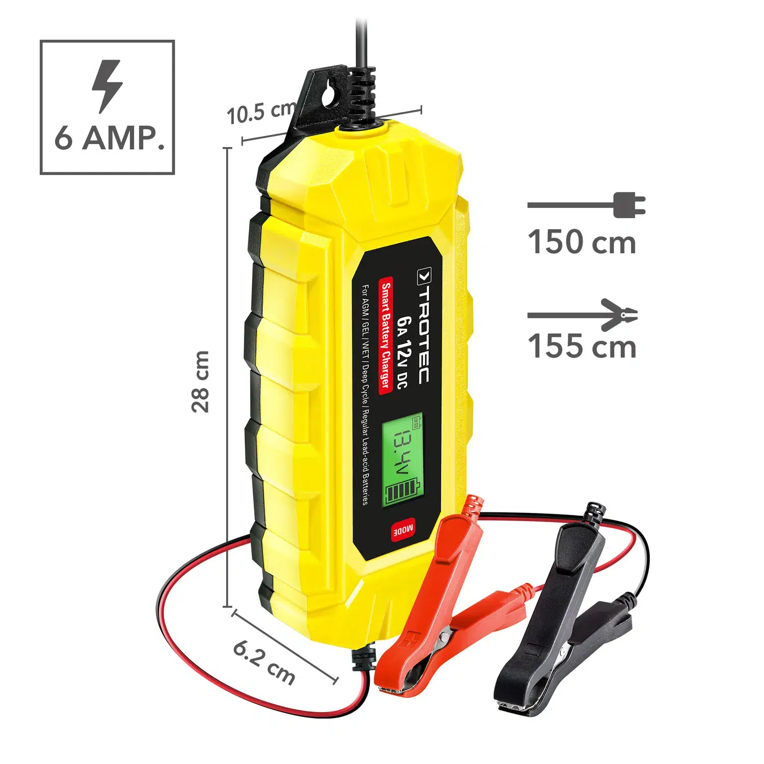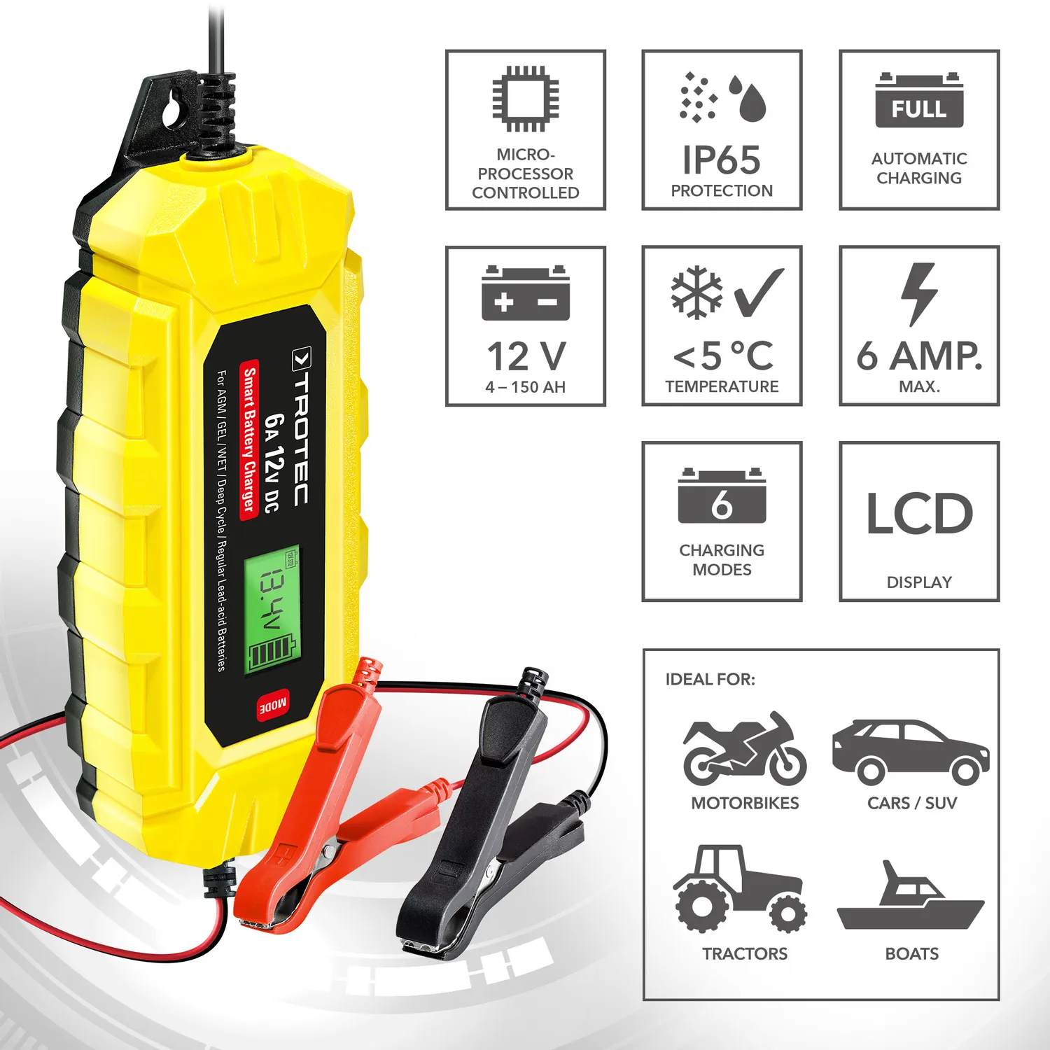 Batteriopladerne i PBCS-serien fra Trotec giver dig den rigtige oplader til enhver type køretøj. Den bærbare batterioplader PBCS 6A med 6 ampere ladestrøm og baggrundsbelyst LC-display er en mikroprocessorstyret allroundoplader med en 10-trins opladningscyklus. Uanset om det drejer sig om hurtig opladning, rekonditionering efter dyb afladning eller opretholdelse af alle indstillinger ved batteriskift, anbefales PBCS 6A til vedligeholdelse af 12-voltsbatterier mellem 4 Ah og 150 Ah, f.eks. til biler/SUV’er, motorcykler, traktorer eller motorbåde, takket være dens enestående komplette udvalg af funktioner. Både vedligeholdelsesfrie og ikke-vedligeholdelsesfrie 12 V-batterier understøttes, herunder våde batterier som bly-syre-, Ca/Ca- og EFB-batterier samt gel- og AGM-batterier. Opladeren er tilpasset de teknisk avancerede og kraftige batterier i moderne køretøjer og tilbyder dig en række tekniske beskyttelses- og plejemekanismer og sikrer hurtig, skånsom opladning for at maksimere batteriets levetid ved fuld effekt.
