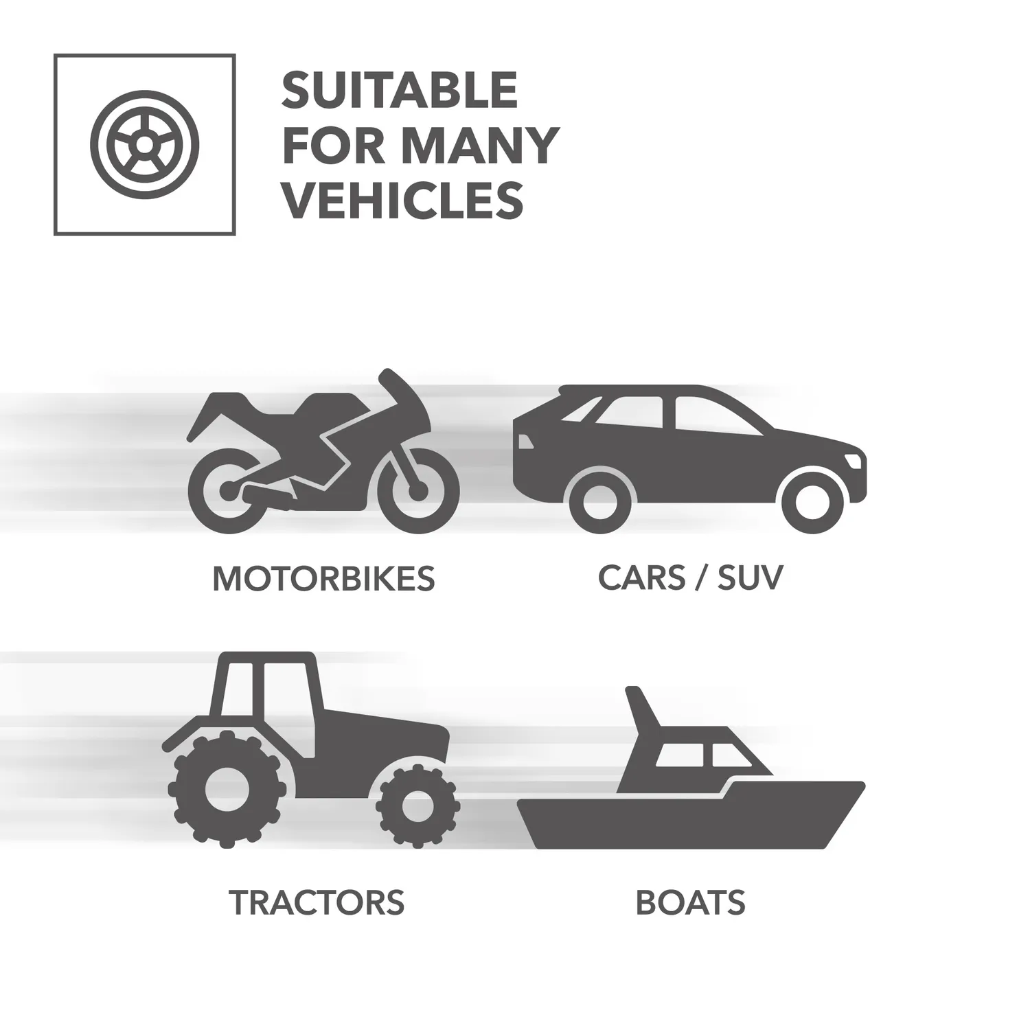 - Ideel til køretøjer med et 12 V-batteri, f.eks. biler, SUV’er og motorcykler