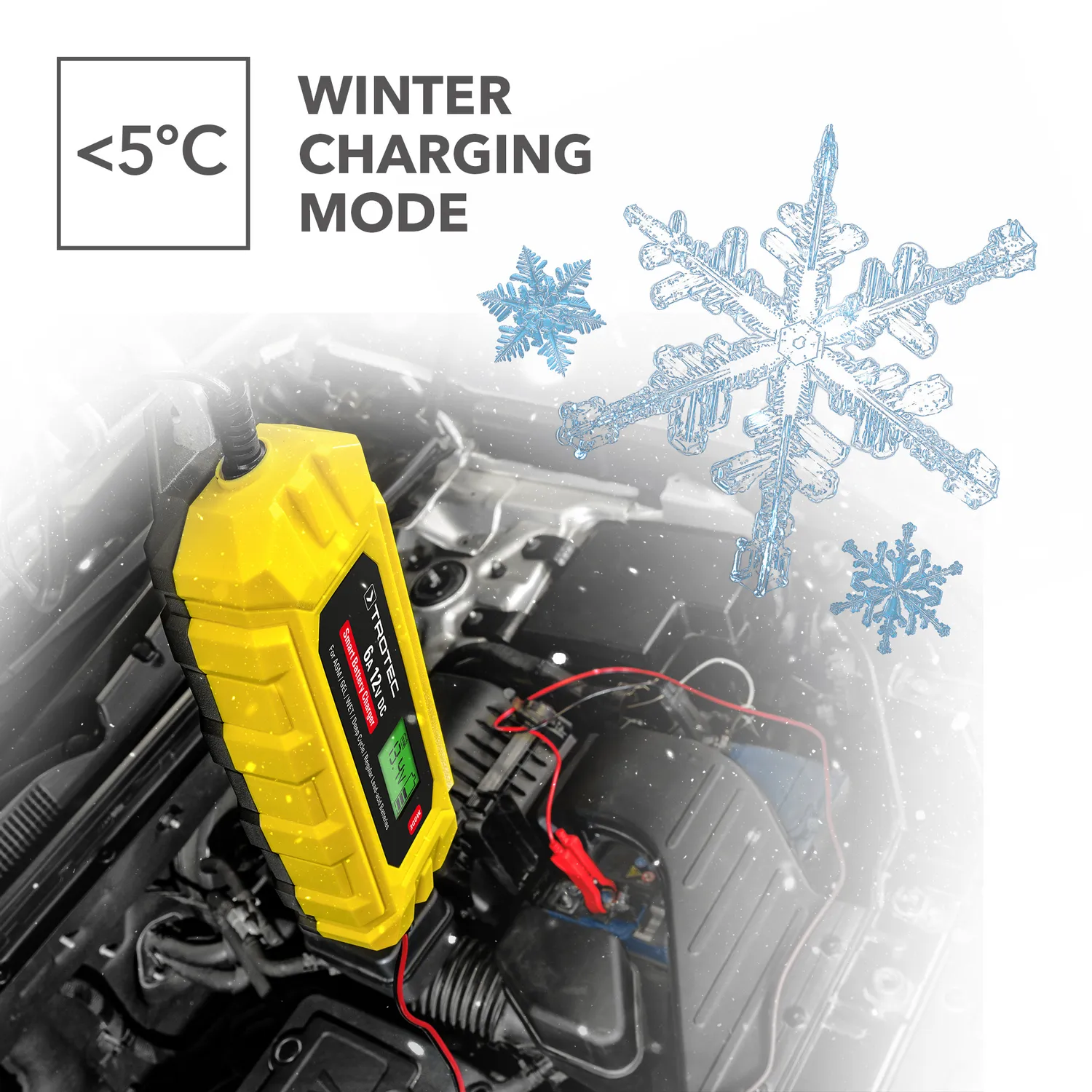 Moderne batterier (bly-syre, AGM og gel) er ekstremt temperaturfølsomme. Hvis omgivelsestemperaturen falder til under 5 °C, bliver de kemiske processer i et blybatteri langsommere. Vinteropladningstilstanden anbefales derfor til hurtig opladning af 12 V-batterier i kolde omgivelser (-20 °C til +5 °C) med en øget slutspænding.