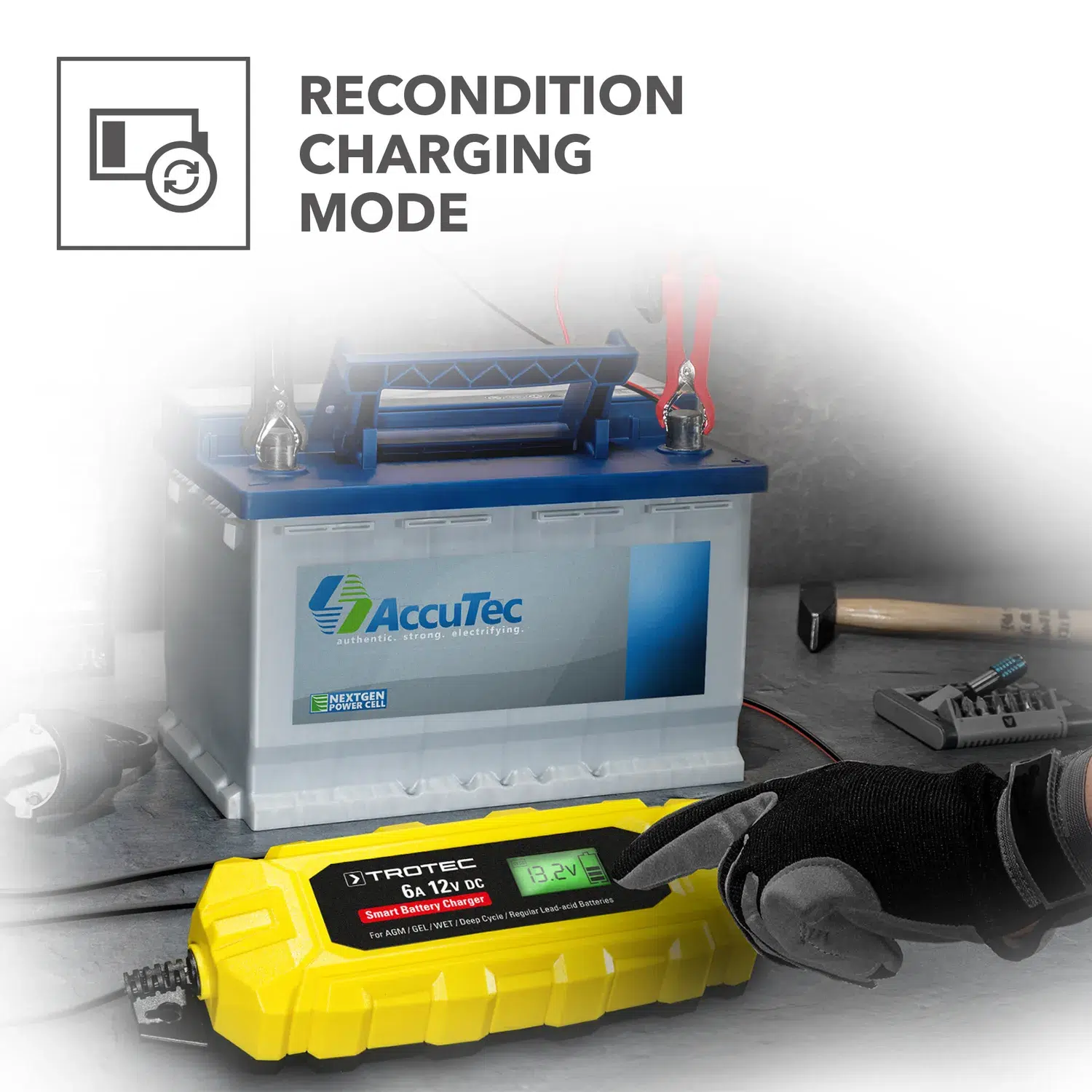 Rekonditioneringsfunktionen bruges til at reparere dybt afladede blysyrebatterier, så de kan genvinde deres nominelle kapacitet. Batteriets levetid forlænges, og i mange tilfælde kan rekonditionering gøre det unødvendigt at købe et nyt batteri. Rekonditioneringsfunktionen er ikke egnet til batterier med et lukket design (f.eks. AGM eller gel).