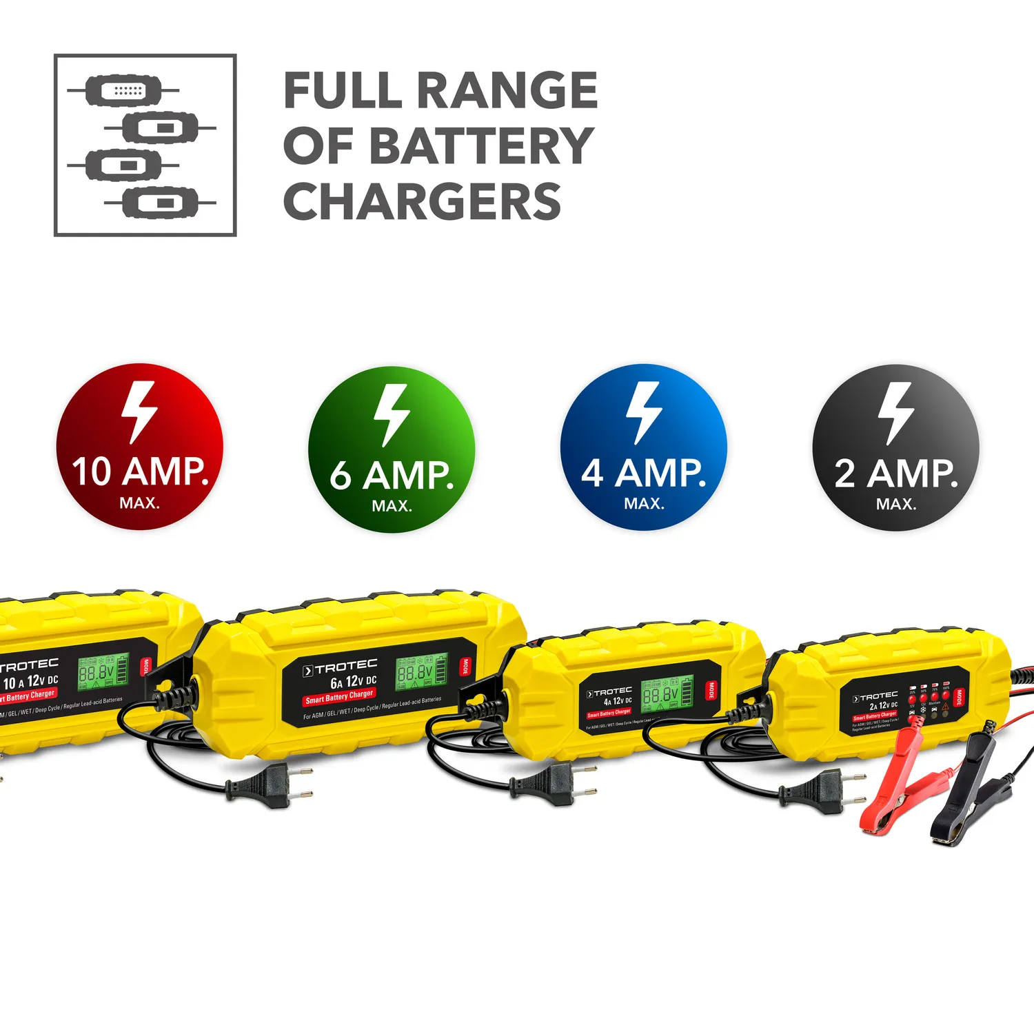 Valget af den rigtige oplader bør overvejes nøje, afhængigt af hvor meget opladningsenergi du har brug for til dit køretøj. Trotec tilbyder i alt 4 batteriopladere, PBCS 2A, PBCS 4A, PBCS 6A og PBCS 10A, med en ladestrøm på op til 10 A og en kapacitet på op til 200 Ah i sit omfattende udvalg af bilteknologi. Så du har den rigtige oplader til enhver anvendelse!
