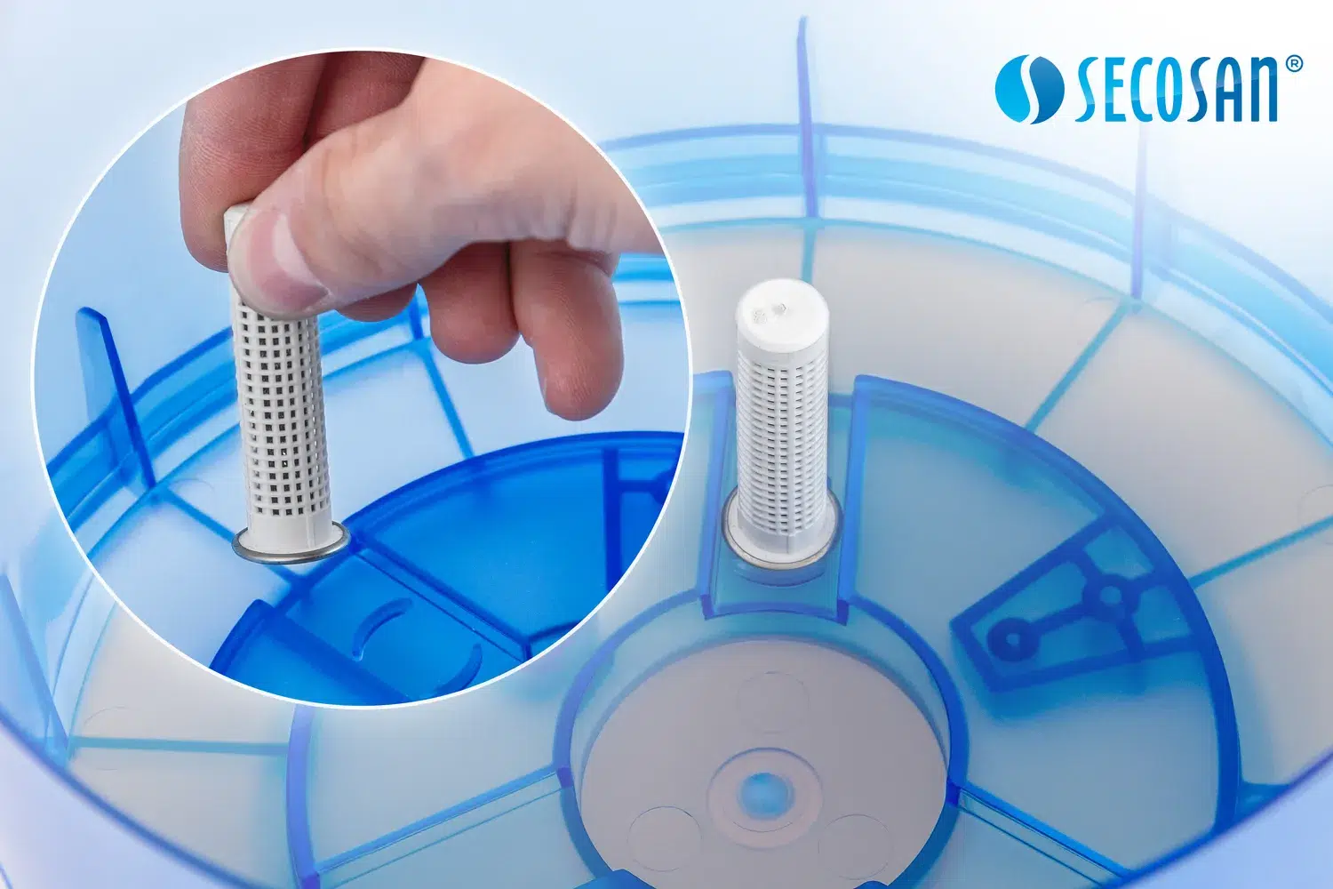 Dette fordampningsfilter forbliver således konstant fugtet på en naturlig måde, hvilket er grunden til, at B 24 E, i modsætning til klassiske roterende befugtere, ikke kræver nogen mekaniske sliddele til filterbefugtning.