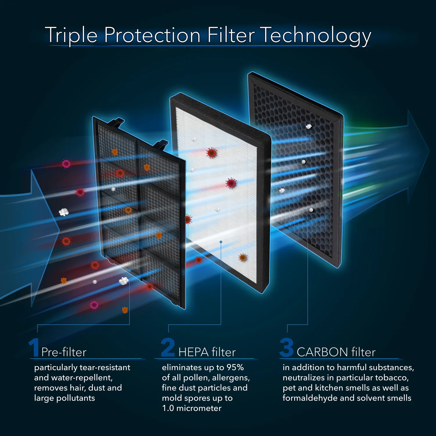 Det kombinerede rumluftfiltersystem bestående af et forfilter og et gennemprøvet HEPA-filter filtrerer alle typer forurenende stoffer og de mest almindelige allergener fra rumluften med en filtereffektivitet på 95 %. Det valgfrie kulstof-HEPA-filter bestående af aktivt kul filtrerer ikke kun forurenende stoffer, men absorberer også ubehagelige lugte fra den omgivende luft.
