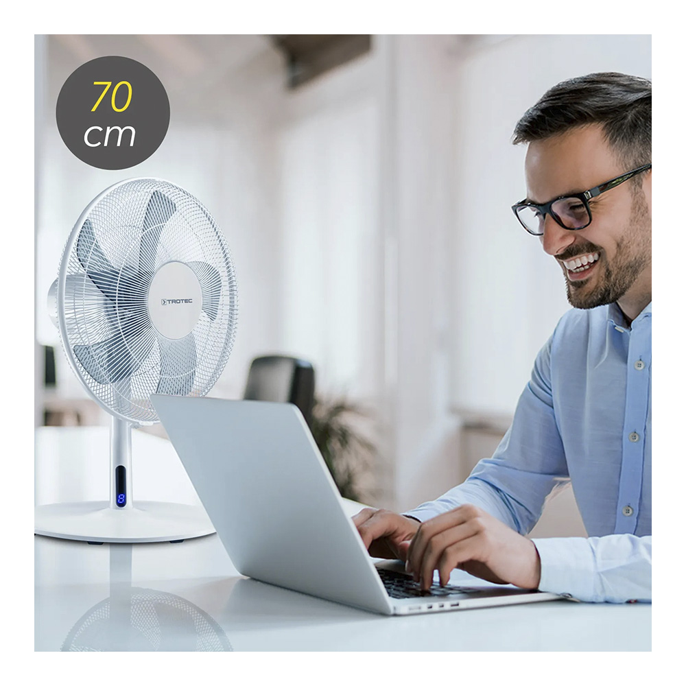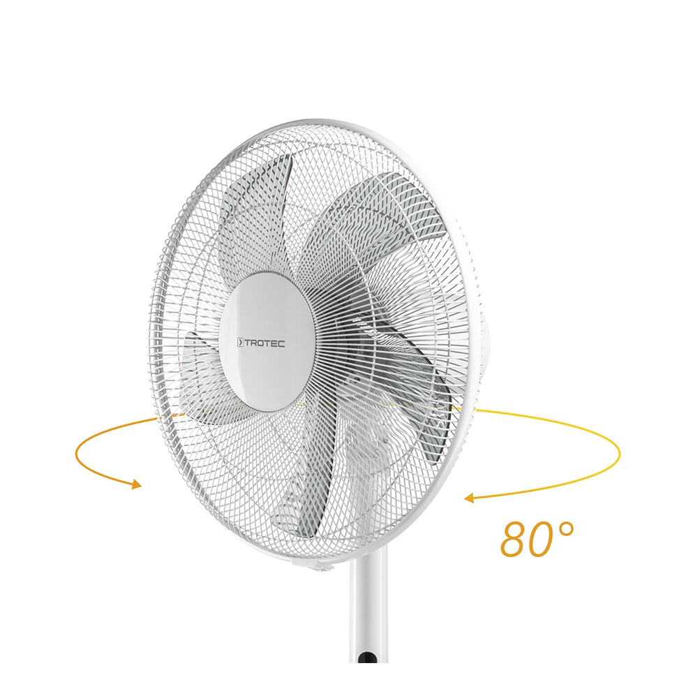 Mens foråret og sensommeren allerede sikrer en let ventilation og behagelig forfriskning, har man brug for en kraftig vindstyrke på rigtige varme sommerdage. Indstil altid til dit individuelle behov, ventilationstrinet justeres altid præcist, da TVE 24 S findes med 8 fine bibeholdte hastighedstrin. Luftstrømmen fordeles efter ønske jævnt i hele rummet med den integrerede 80-grader-oscillation. Ventilatorhovedet svinger automatisk fra venstre til højre og sikrer med et ensartet intervall til en frisk brise. Desuden kan ventilaterhovedet manuelt svinges indtil 30 grader, indstil luftstrømmen bare i den passende vinkel opad eller nedad. TVE 24 S højeste drift trin er også kun med 60 dB(A) vidunderlig rolig.