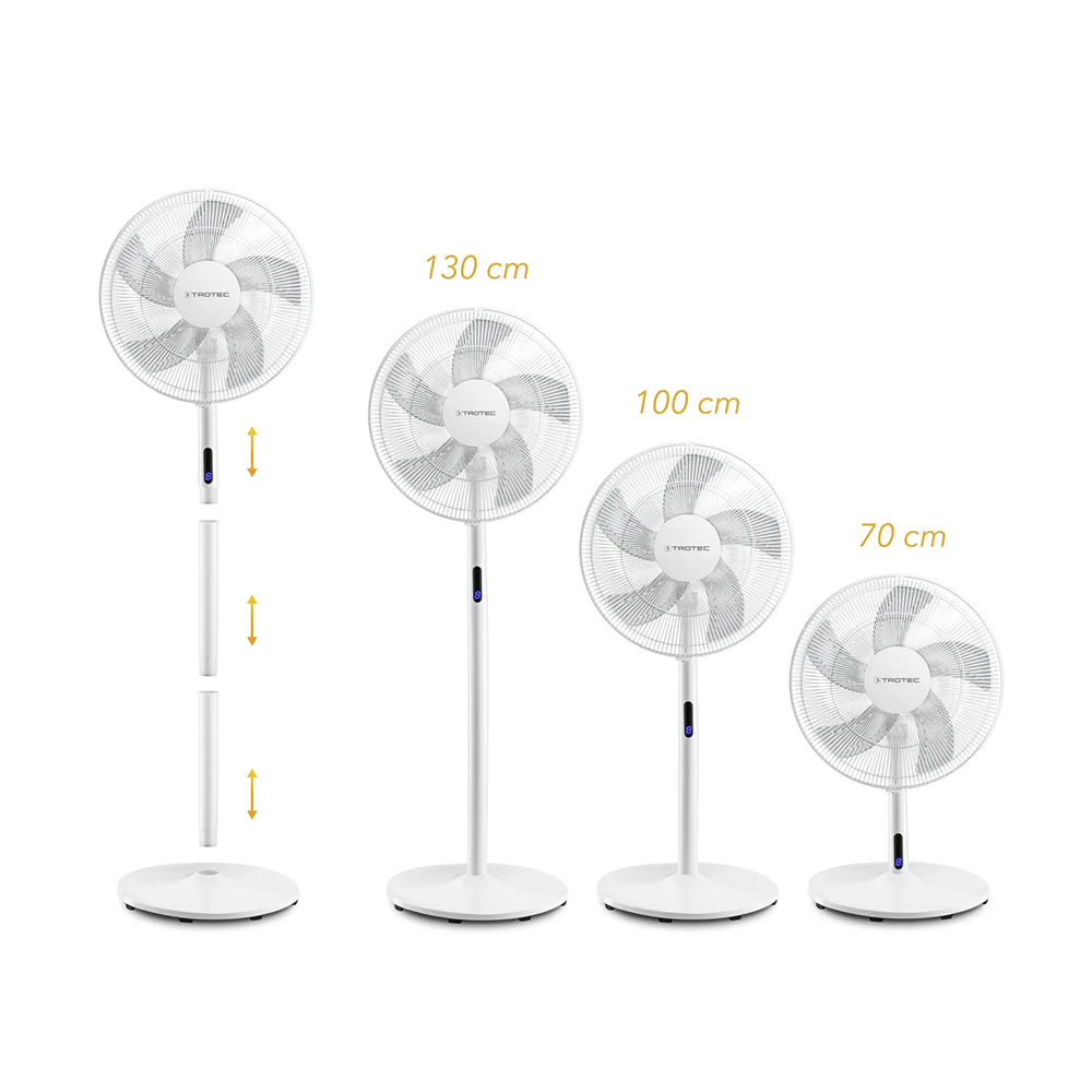Enhedshøjden justeres over det praktiske stangsystem tredobbelt på 1,3 meter, 1 meter eller kun 70 cm, fjernes med det samme med to mellemstænger, netop til at udskifte standardenheden til en bordventilator. Ventilatorens højeste indstilling (1,3 meter) egner sig særligt godt til at fordele frisk luft bredt i rummet. Med den mellemste indstilling (1 meter) overføres luftstrømmen optimalt til siddende personer. TVE 24 S mindste indstilling (70 cm) præsenterer den som stilfuld bordventilator på dit skrive- eller spisebord.