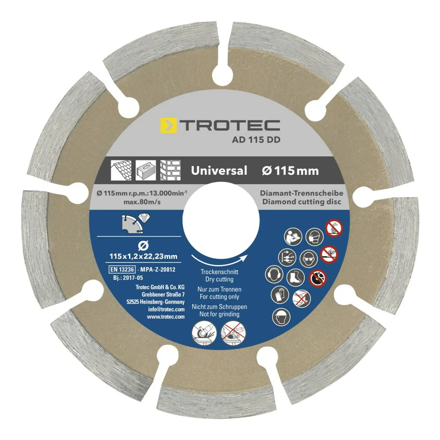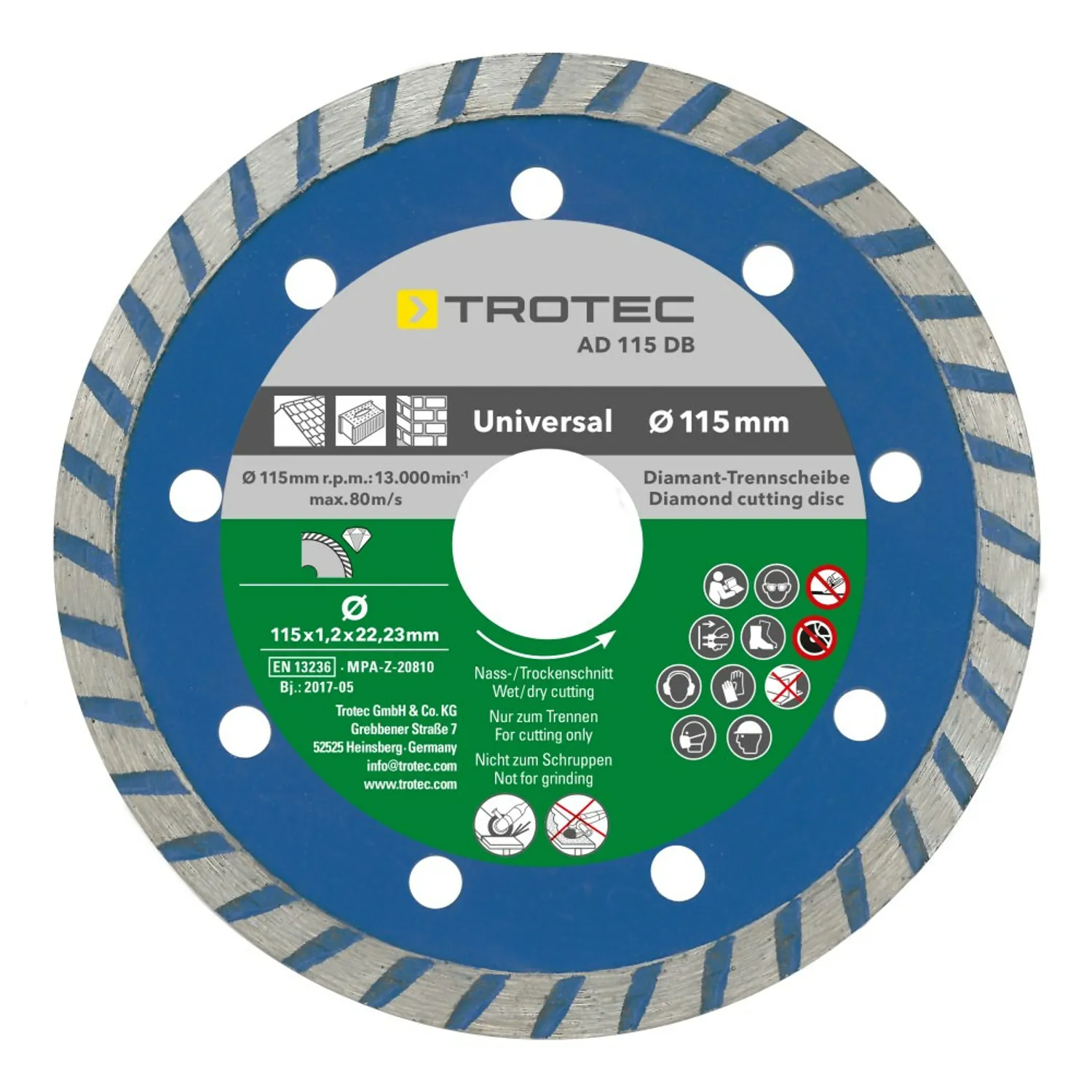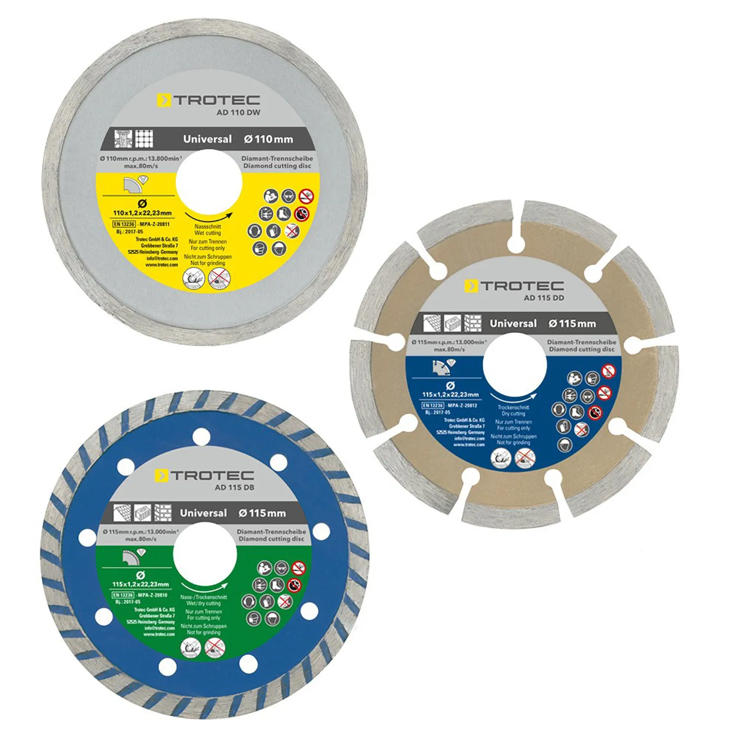Med dette sæt kan du altid udføre det rigtige snit. Fuld kant, segment og 2 x turbo som pakke i Trotec-kvalitetsmærke! Alle diamant-skæreskiver i dette sæt blev fremstillet ifølge kvalitet- og sikkerhedsstandard EN 13236.