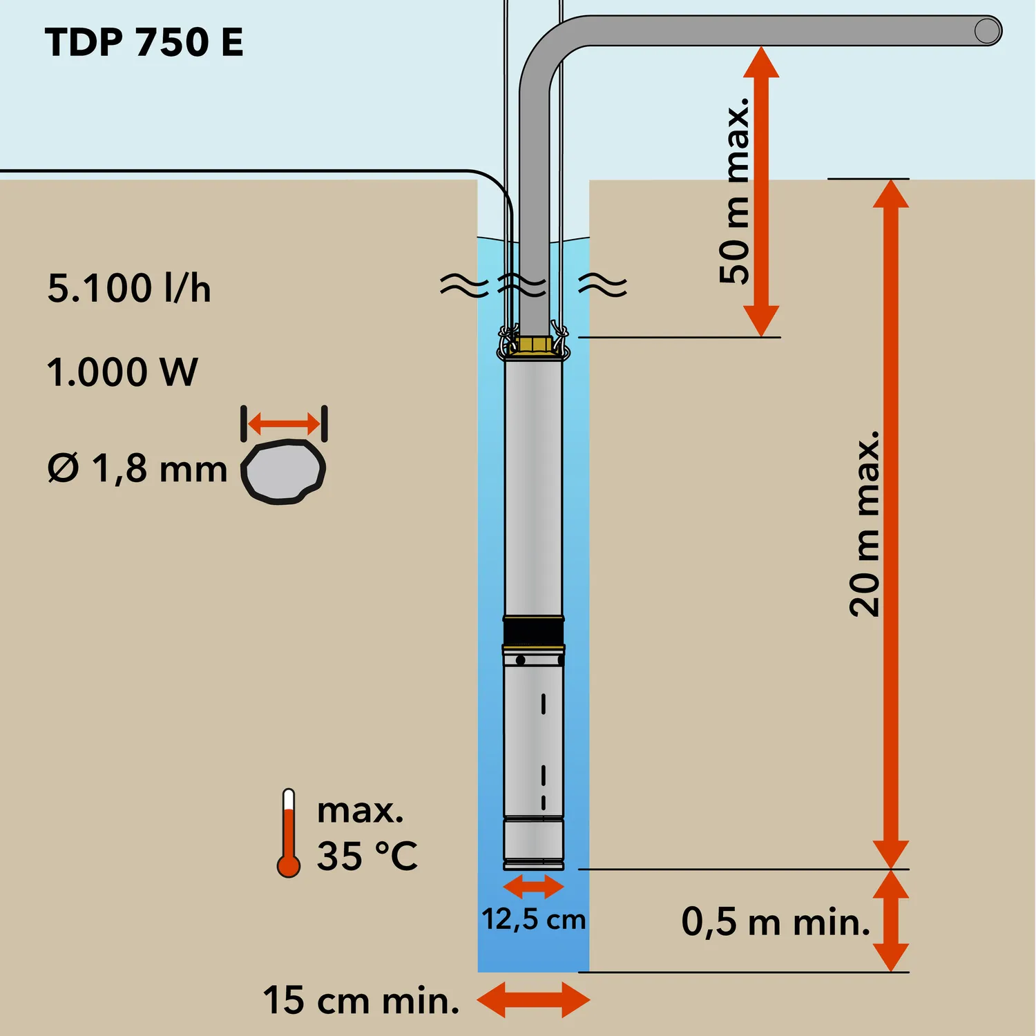 Det 23 meter lange undervandskabel forsyner den ekstremt kompakte pumpe pålideligt med strøm, og den er derfor plug & play til øjeblikkelig brug. Desuden har pumpehuset på TDP 370 E to ophængningsøjer på hovedenden, så den nemt kan sænkes ned i det vand, der skal pumpes. Den valgfrie afstandsfod gør det muligt at sænke dybbrøndspumpen ned i bunden af den forborede fordybning, f.eks. en drænskakt eller brønd. I dette tilfælde skal bunden af brønden dog være ren og fri for snavs.