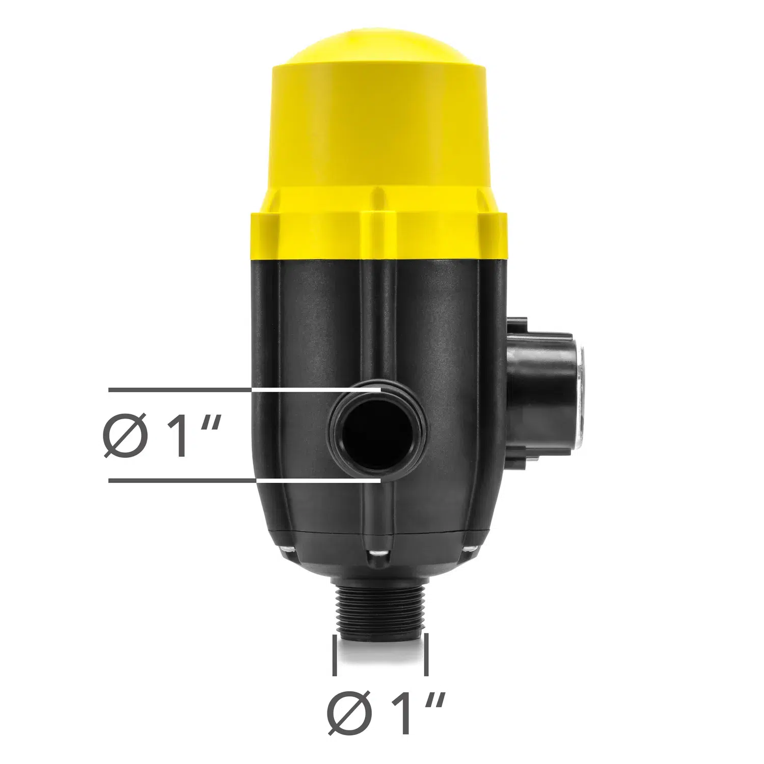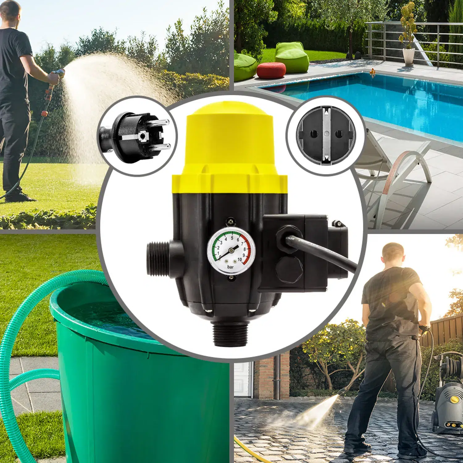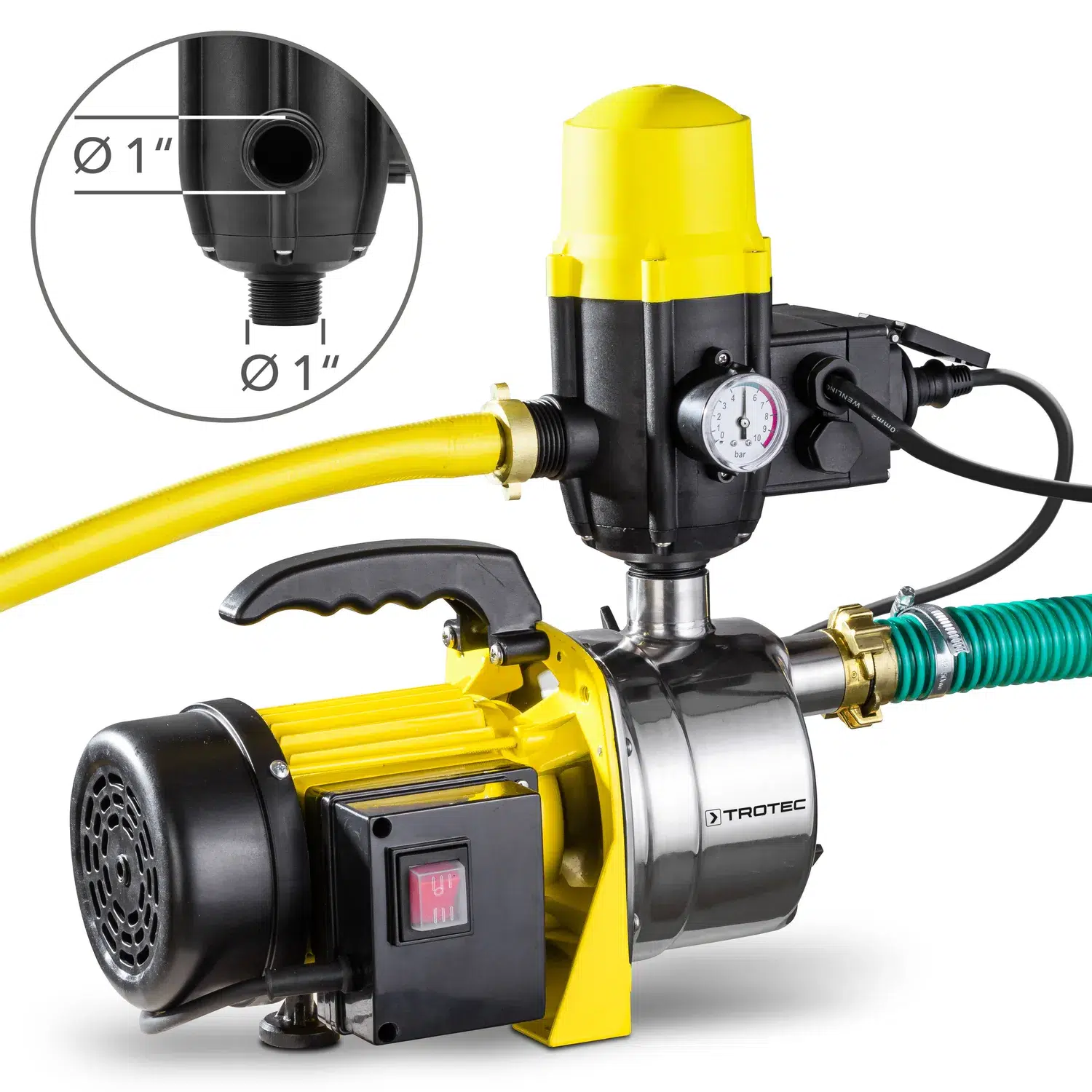 Den kompakte trykafbryder installeres simpelthen mellem pumpen og den tilsluttede forbruger (f.eks. Vandhane eller haveslange), og vandet pumpes automatisk uden manuelt at tænde og slukke pumpen. Trykafbryderen i det tilsluttede rørsystem sikrer konstant vandtryk til havevanding eller husholdningsvandforsyning. Linjetrykket overvåges kontinuerligt af trykafbryderen; hvis trykket falder, tændes enheden automatisk og gendanner trykket. Når linjetrykket nås igen, slukker pumpestyringen automatisk. Dette beskytter pumpen og forlænger levetiden. De to ind- og udløbsåbninger på trykafbryderen er udstyret med 1 ”udvendige gevind og passer således perfekt til fælles pumpe-, slange- eller rørforbindelser.