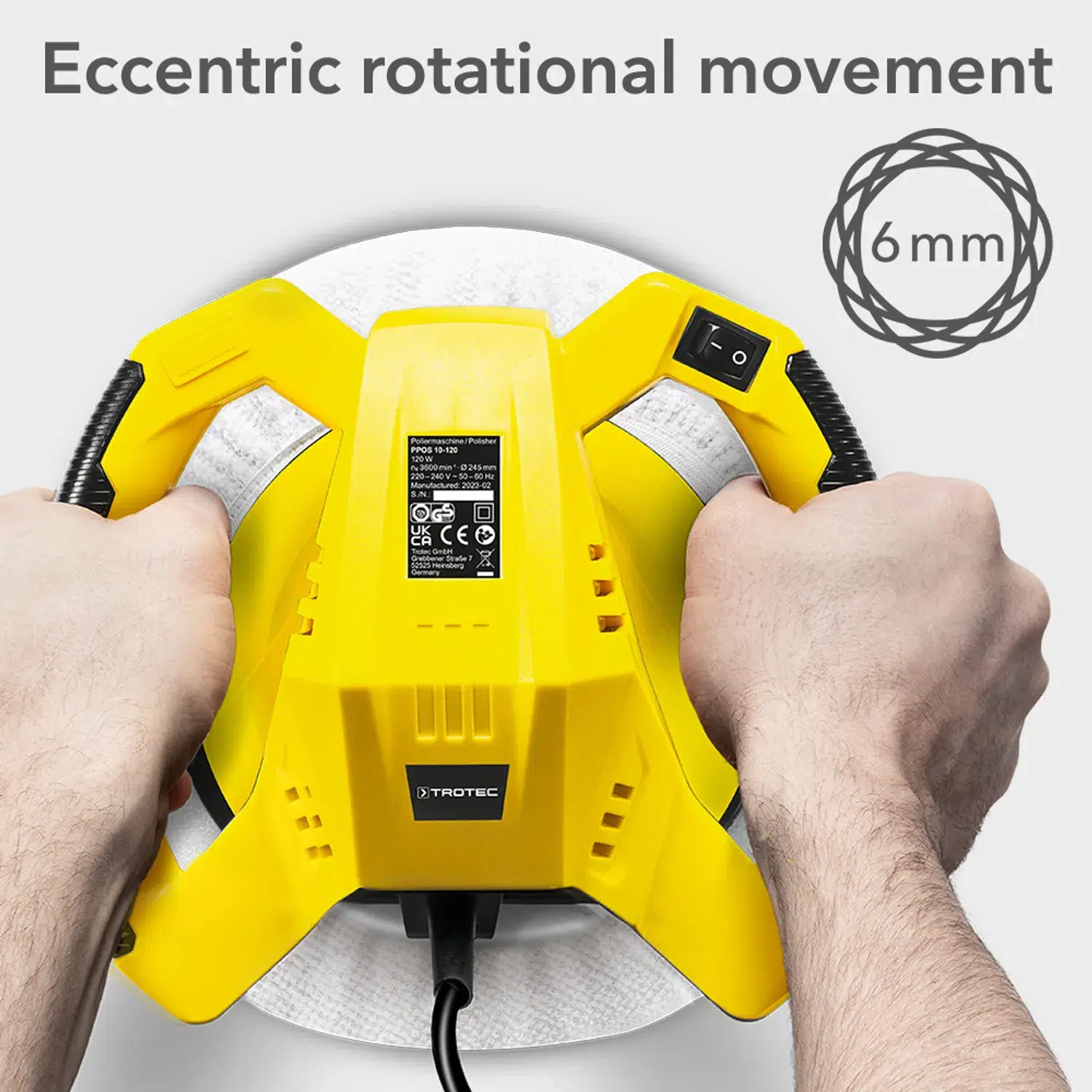 En tænd/sluk-kontakt integreret i håndtaget giver dig mulighed for at slukke for apparatet nemt til enhver tid. Det 5 meter lange netkabel excentriske polermaskine med en kraftig 120 watt motor, selv under belastning motor, selv under belastning, muliggør en stor arbejdsradius og maksimal bevægelsesfrihed under arbejdet.