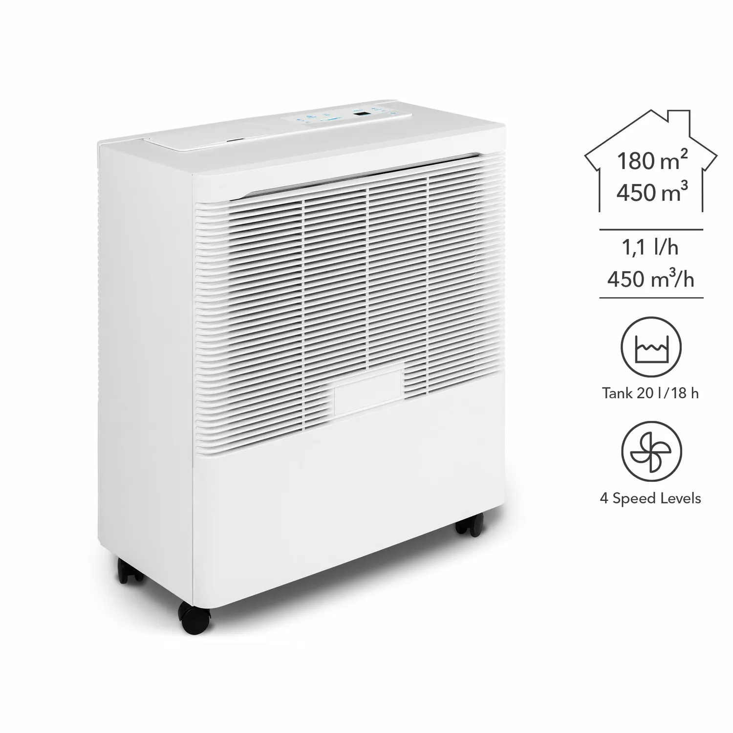 - Enkel betjening med indstillingsmulighed for målfugtighed og ventilatorhastighed