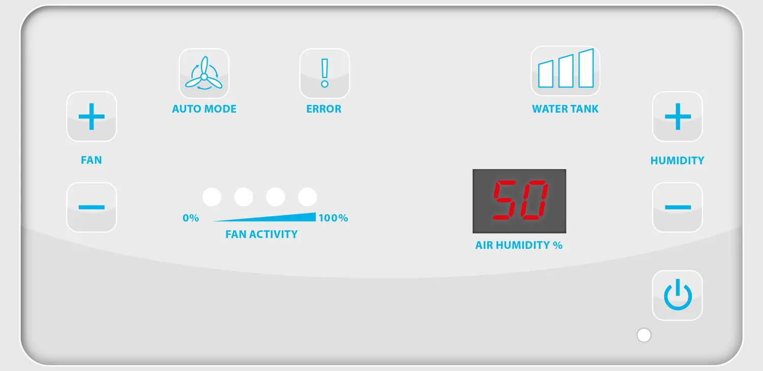- Elektronisk styring med præcis procentvis måling af luftfugtigheden og automatisk slukning, når vandtanken er tom