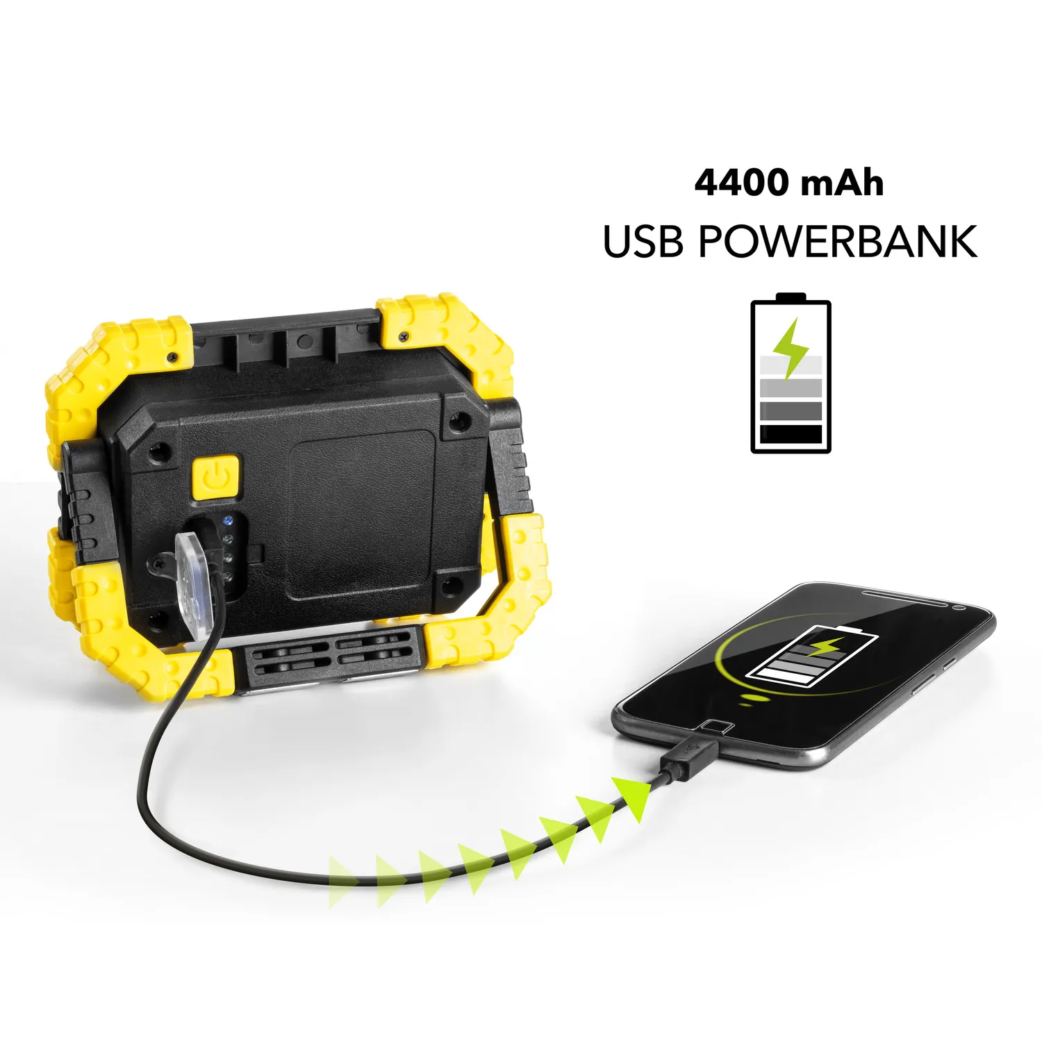 To enheder i én: arbejdslampe og USB-powerbank (4,4 Ah batterikapacitet) Med arbejdslampen PWLS 06-10 behøver du ikke længere bekymre dig om batterilevetiden på dine mobile enheder. Den alsidige LED-arbejdslampe sørger ikke kun for optimalt oplyste arbejdsområder – den integrerede powerbank med USB type A-stik forsyner også mobile USB-enheder som smartphones, tablets og måleinstrumenter med den nødvendige 5 volt spænding. I dag har mange byggepladsradioer også en USB-forbindelse i stedet for et netkabel og kan derfor nemt forbindes med PWLS 06-10.