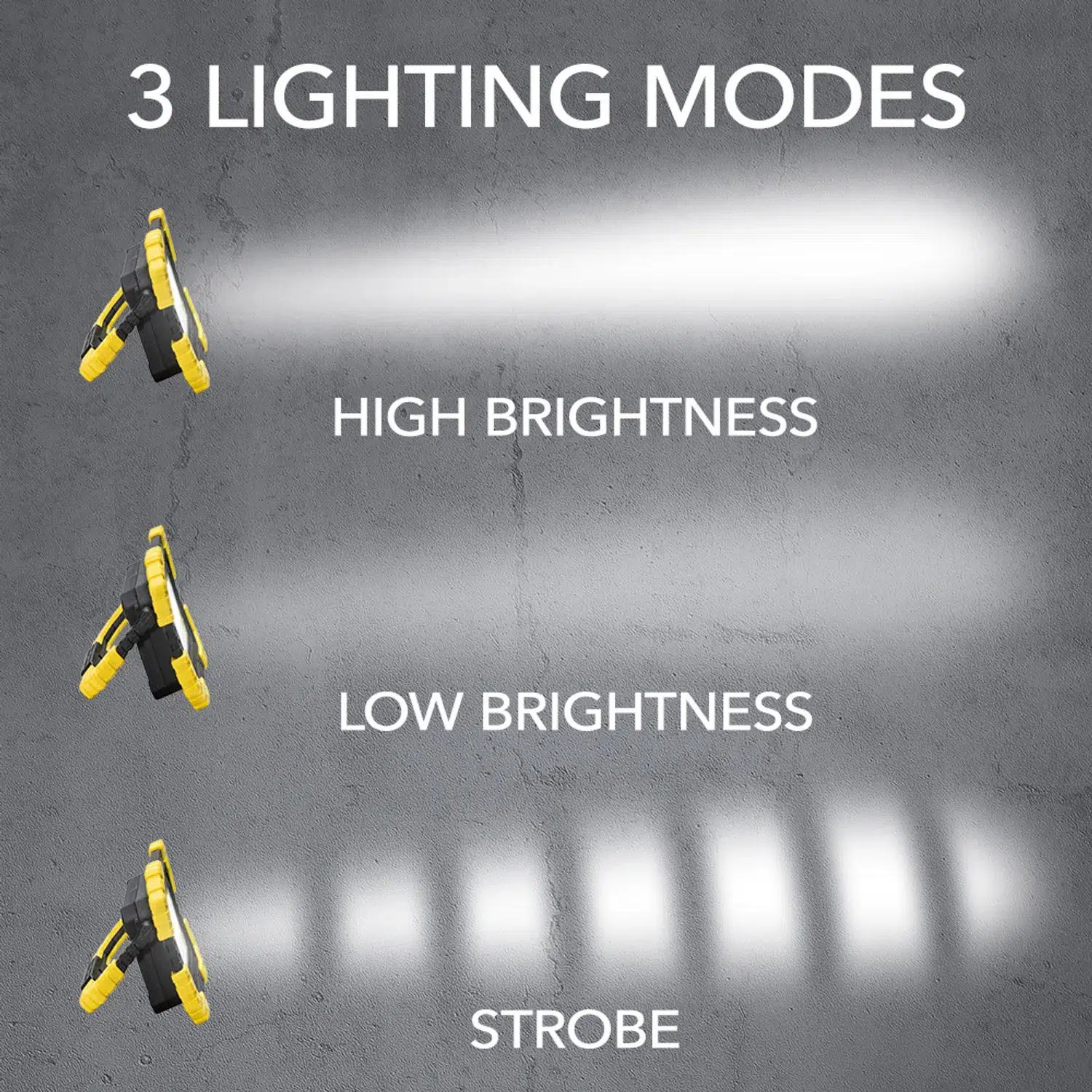 - 3 belysningstilstande: høj lysstyrke, lav lysstyrke, stroboskoptilstand