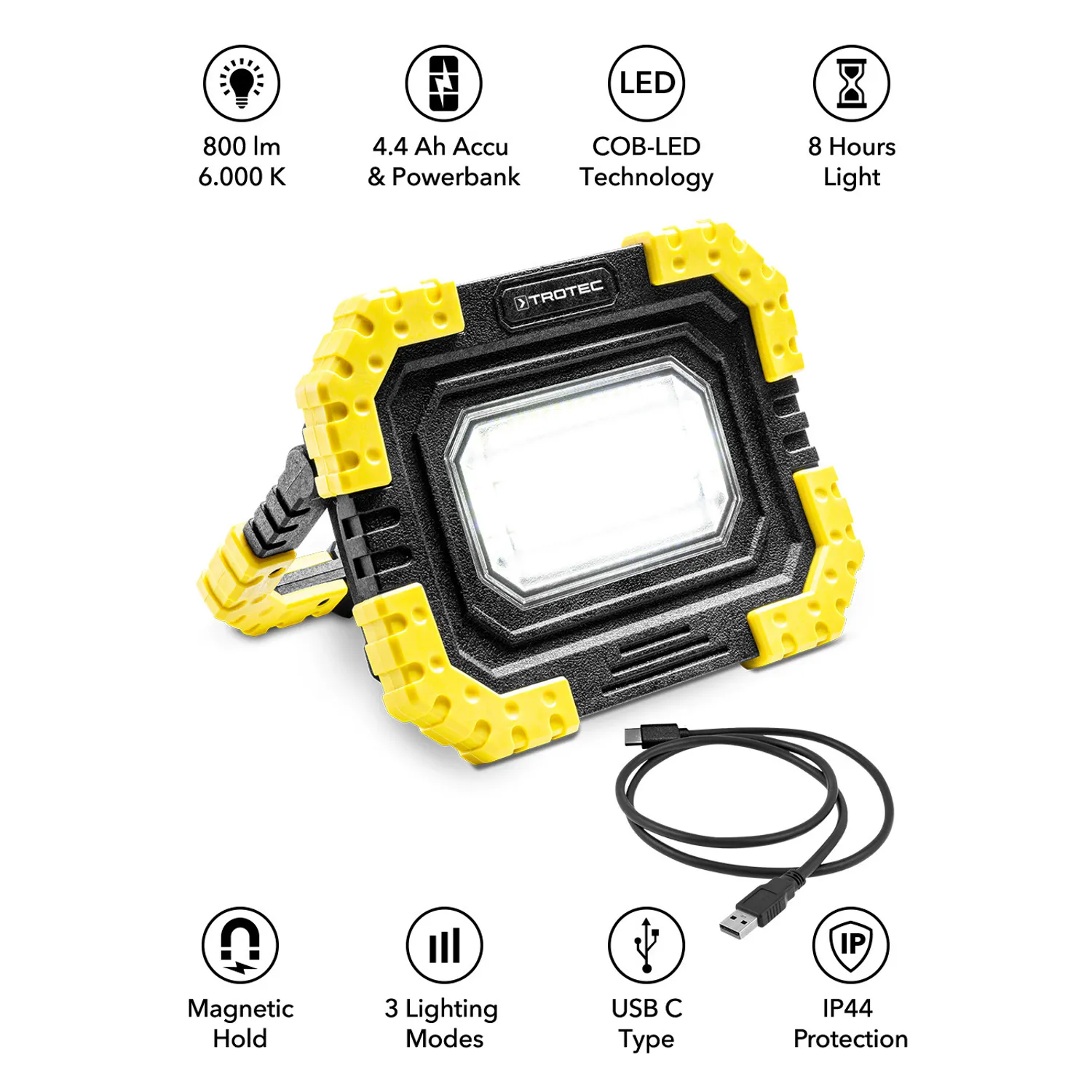 Integreret opladningssystem med USB-tilslutning Selv om de kompakte dimensioner på arbejdslampen, som kun vejer ca. 430 g, ikke tyder på det: Det langtidsholdbare genopladelige litium-ion-batteri er allerede integreret i huset. Et 80 cm langt USB-opladerkabel med USB-stik (type A) og USB-stik (type C) medfølger. Det gør det muligt at oplade LED-arbejdslampen enten ved stikkontakten (med en standard USB-strømadapter) eller via en bil-USB-adapter i bilens 12-volts cigarettænder.