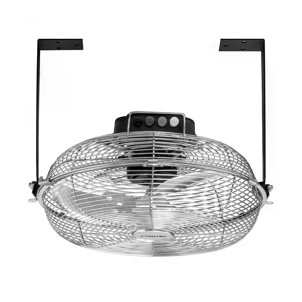 Ventilatoren kan indstilles til det ønskede effektniveau ved hjælp af betjeningselementerne på bagsiden af den forkromede metalrotorkurv. Med de tre tilgængelige hastighedsniveauer klarer TVM 12 ubesværet spændet mellem moderate temperaturer og varme temperaturspidser. Da rotorkurven kan vippes kontinuerligt med op til 100° omkring sin vandrette akse, er det ligegyldigt, om der er brug for køleluftstrømmen nær gulvet eller højere oppe – den vil altid nå dig!