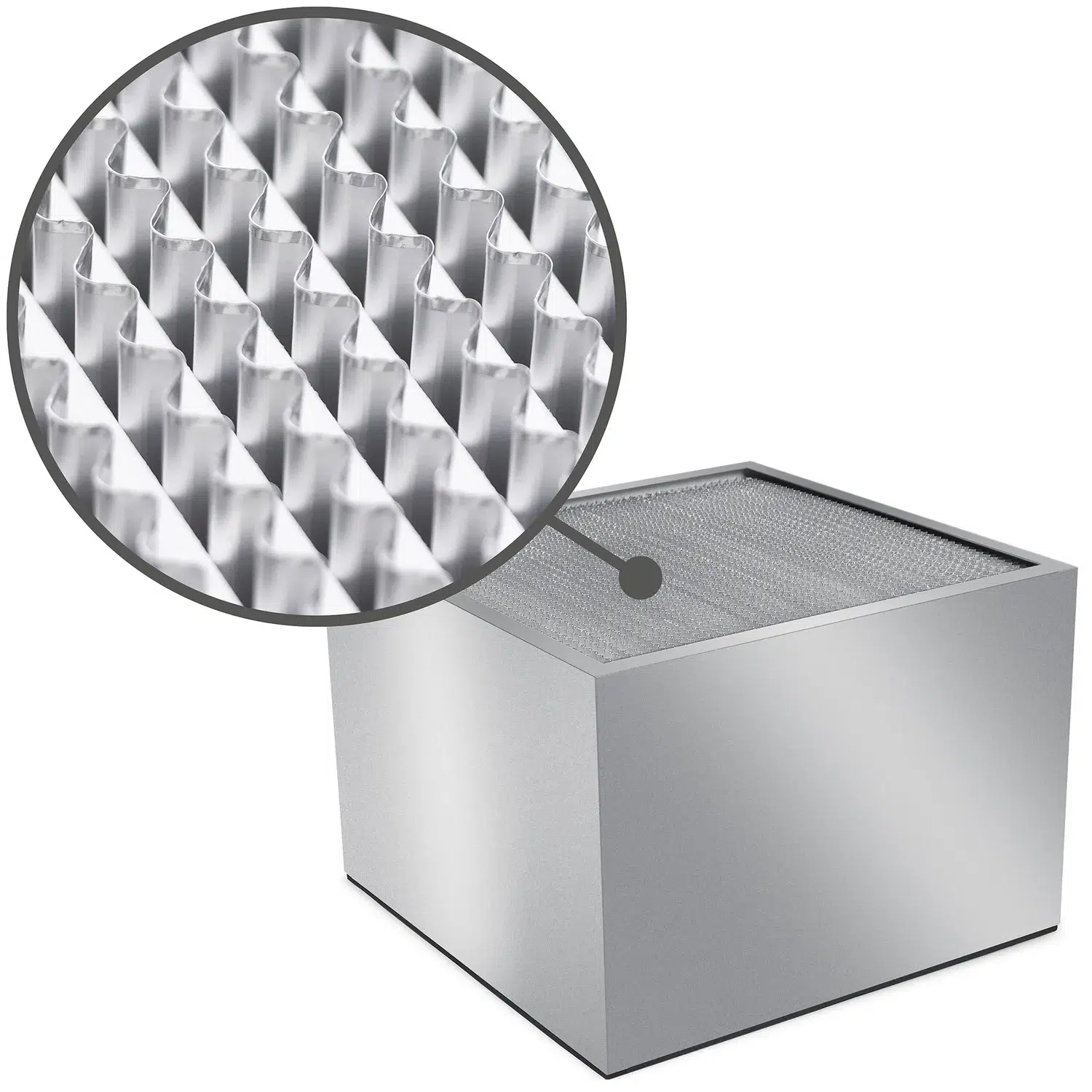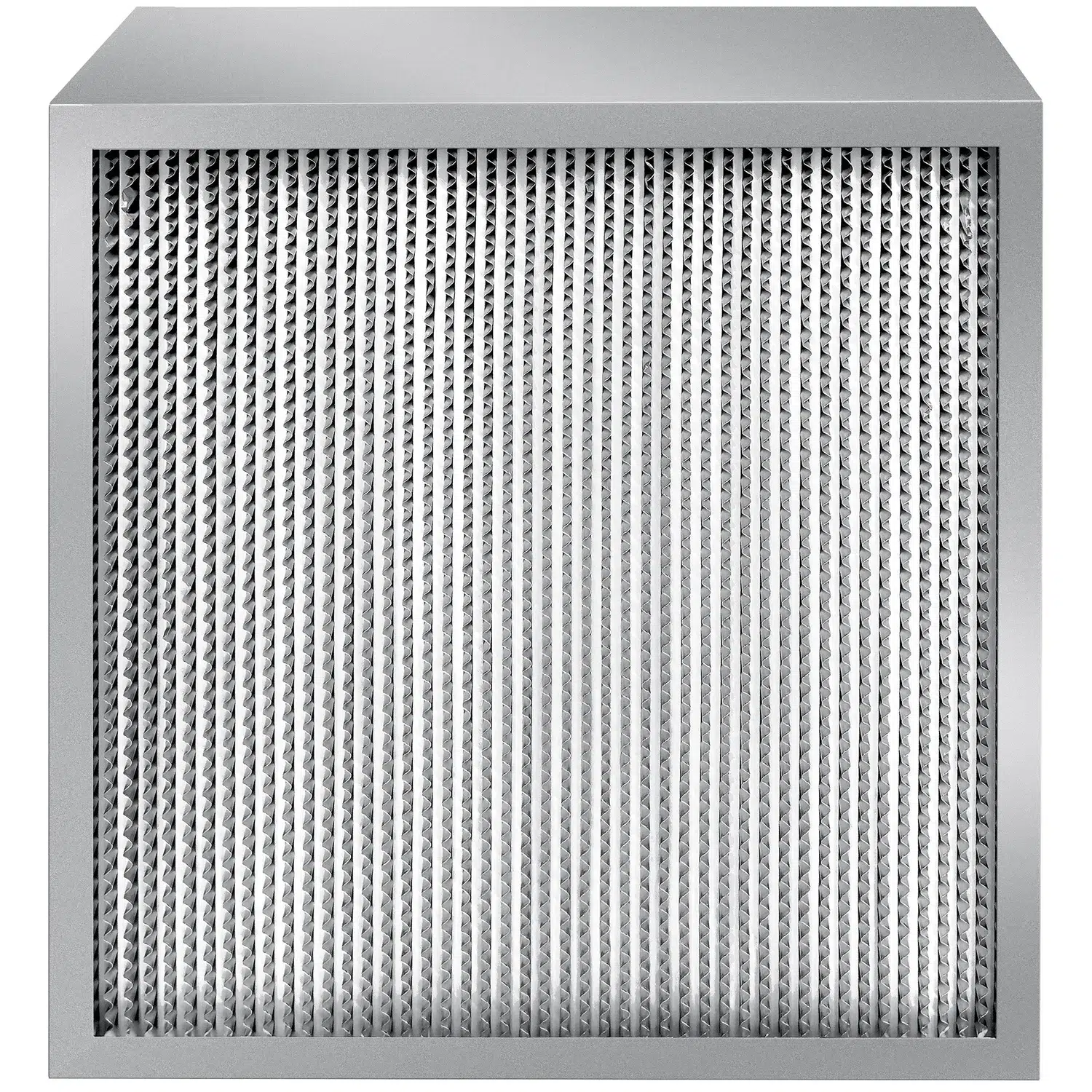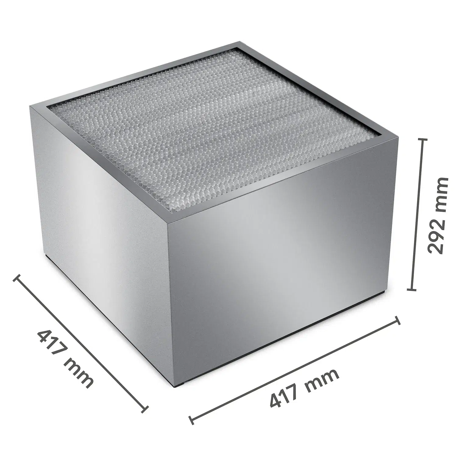 Højtemperaturbestandigt H14 HEPA-filter, der passer til DualDecon-udblæsningstårnet i TES 200 vertikalvarmeren og TAC XT / TAC V+ og TAC M-luftrensere. Dette højtydende specialfilter, der udelukkende er udviklet af Trotec, er kendetegnet ved en separeringseffektivitet på 99,995 % for partikelstørrelser på 0,1 til 0,2 µm og opfylder klasse H14 i henhold til EN 1822.