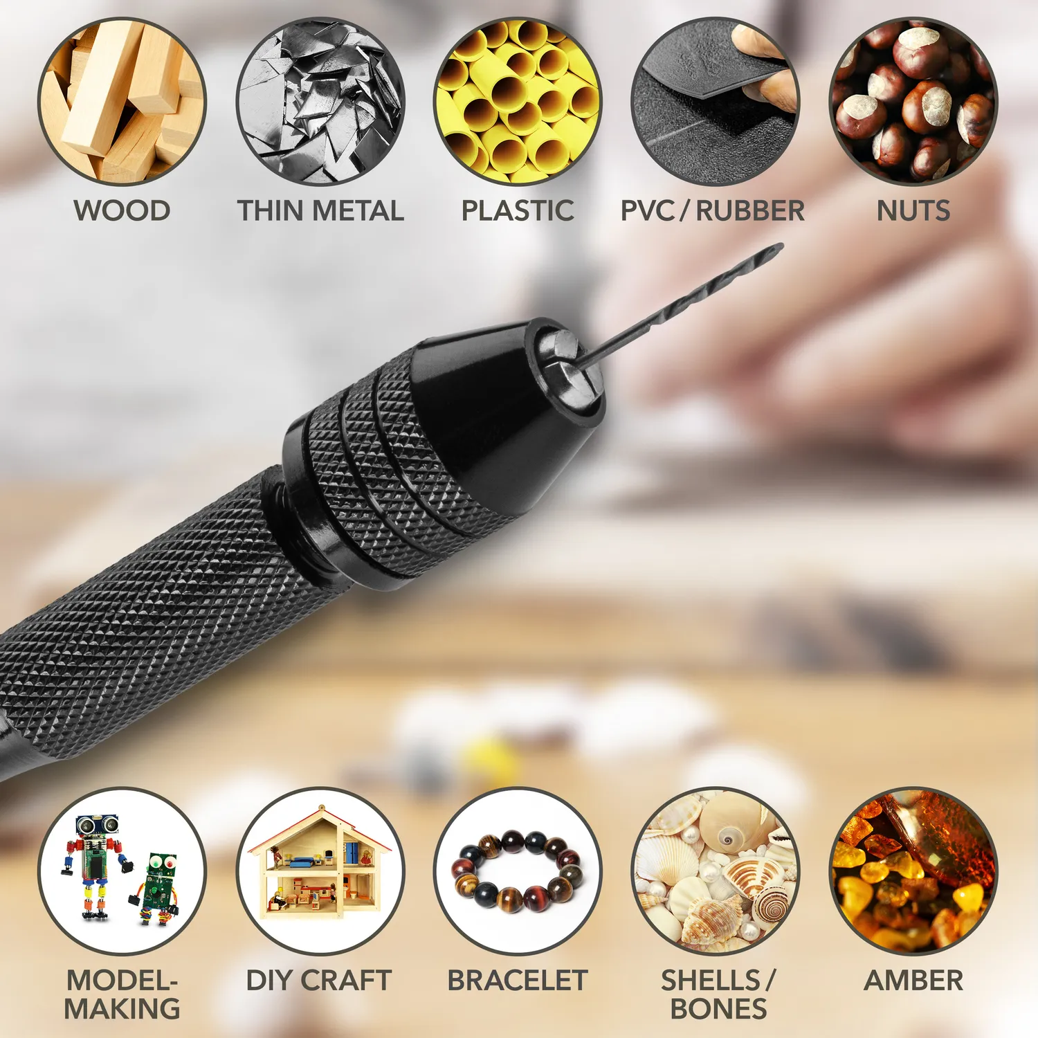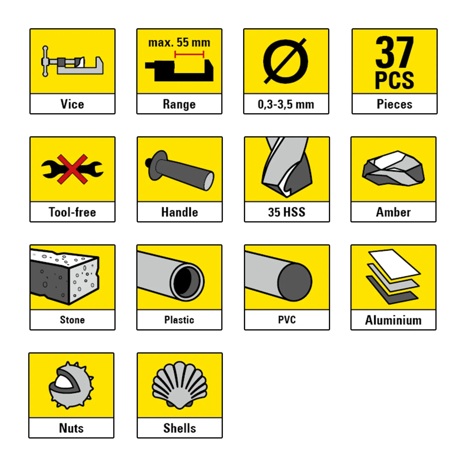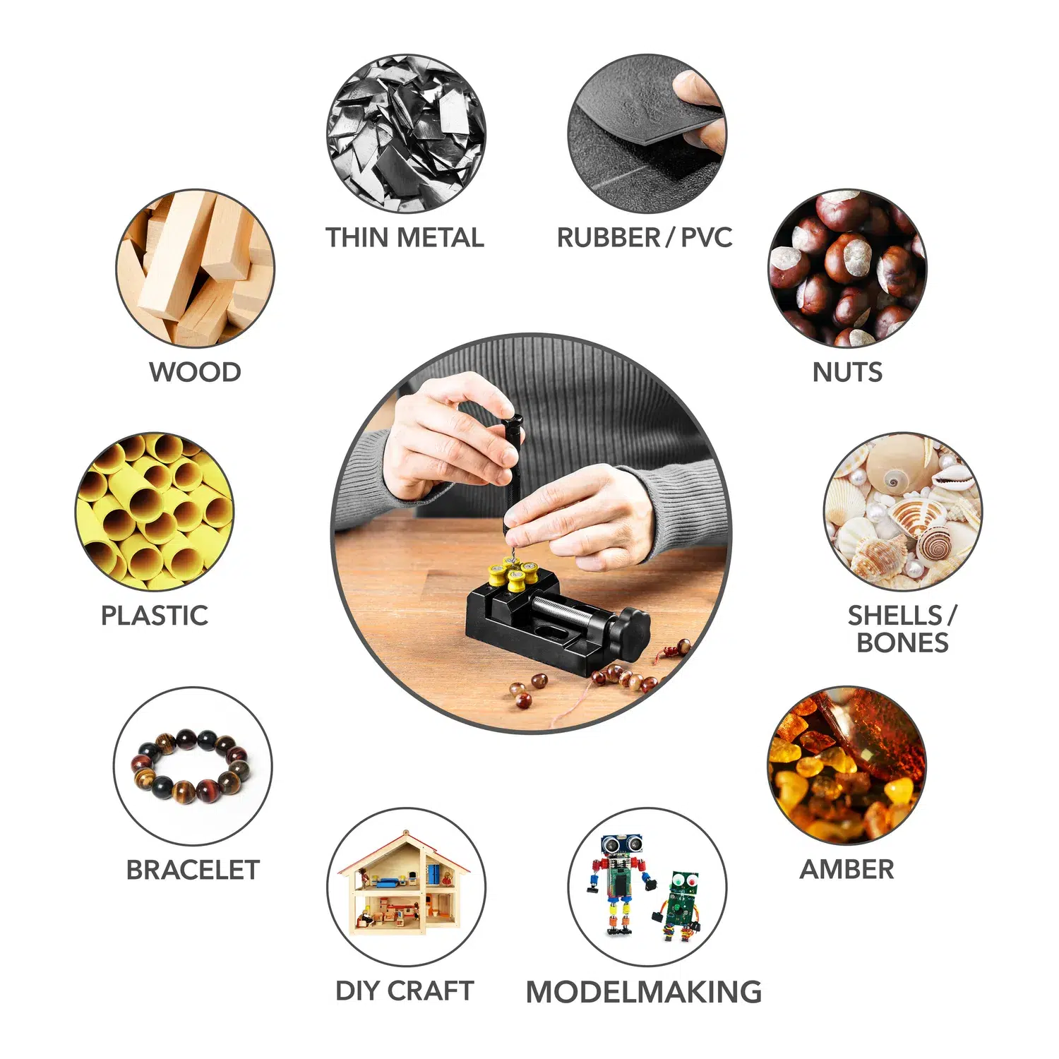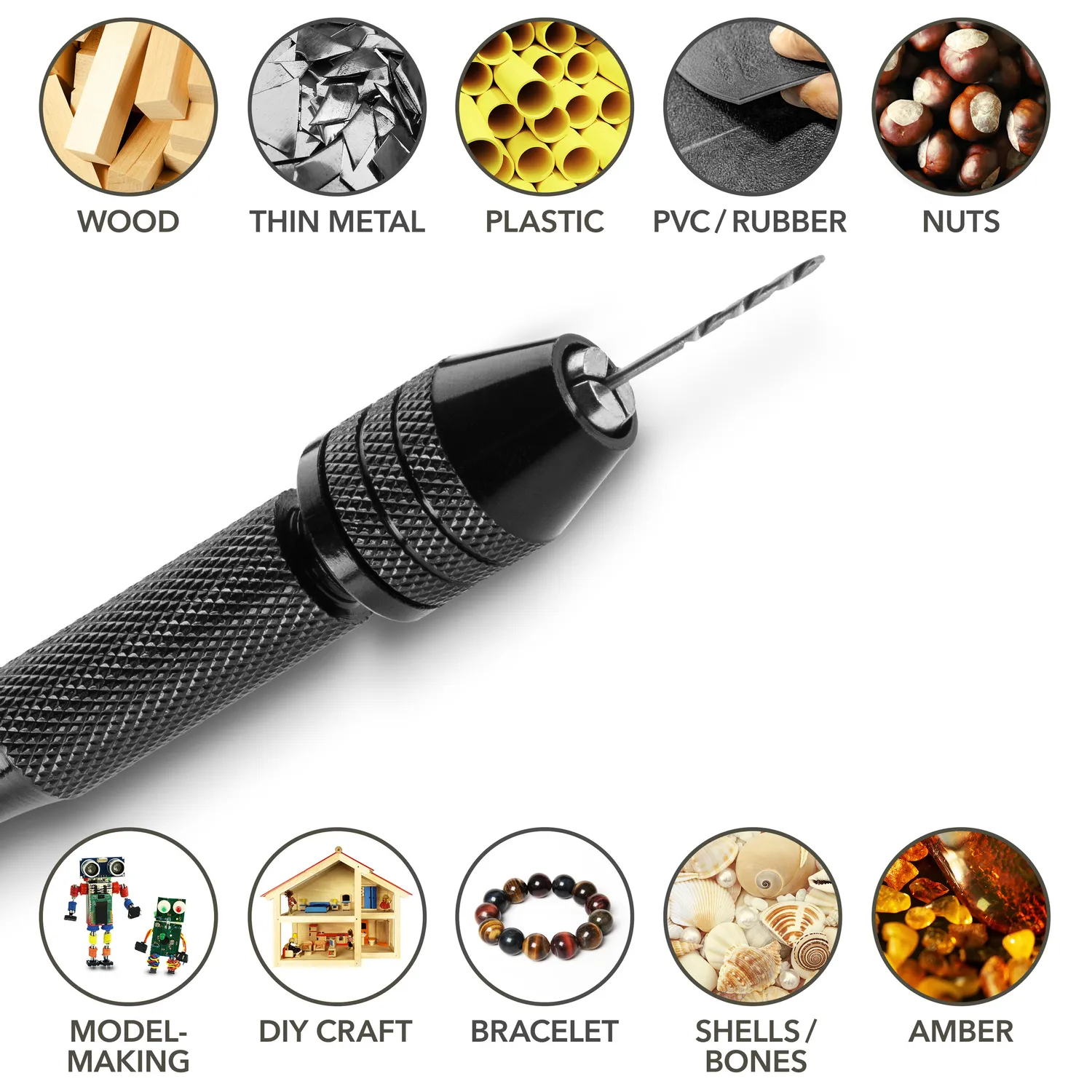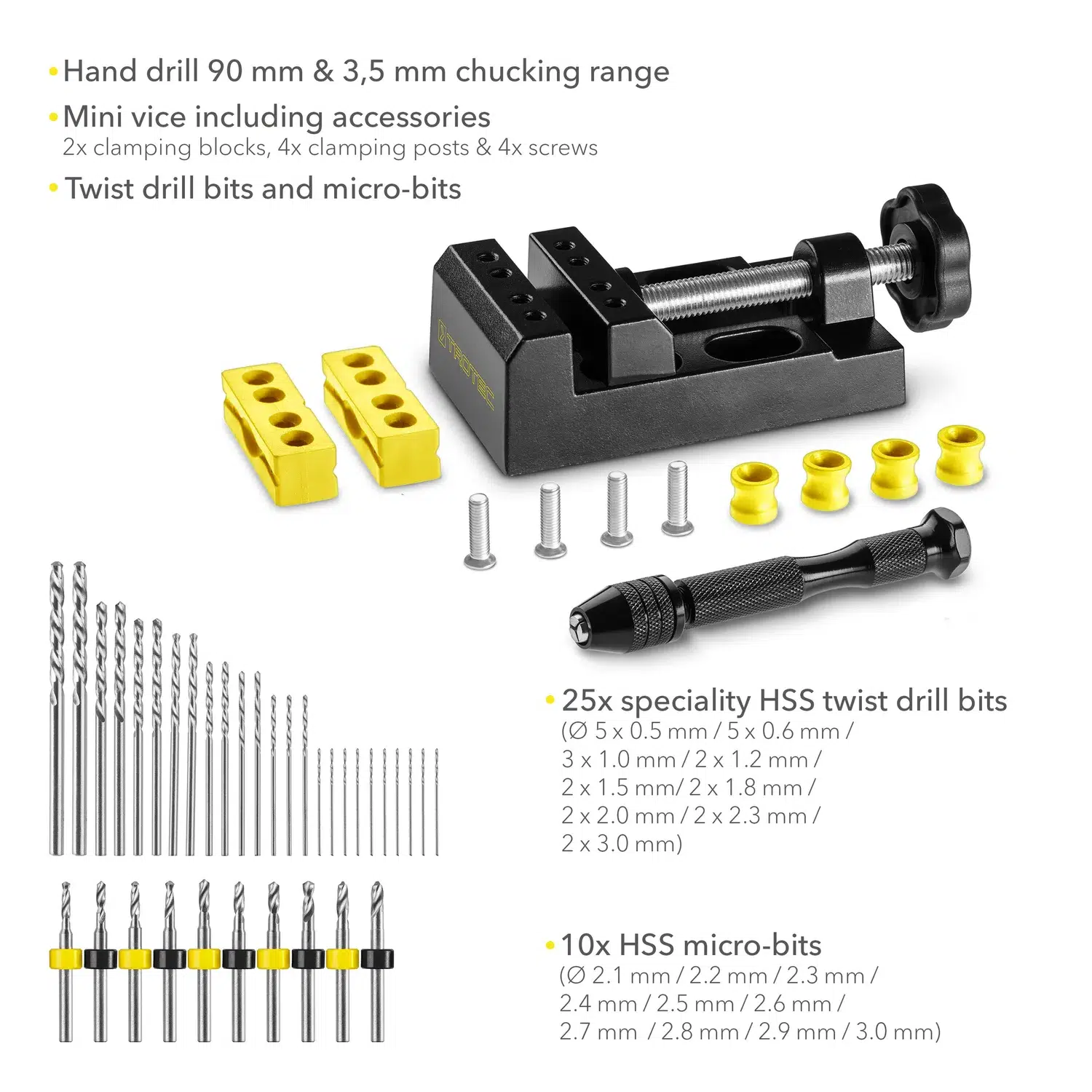 - Håndboresæt med miniskruestik og 35 HSS-spiralbor til bearbejdning af en række forskellige materialer og genstande: f.eks. nåletræ, plast, gummi, PVC, kastanjer, valnødder, skaller, knogler, rav og mange flere.