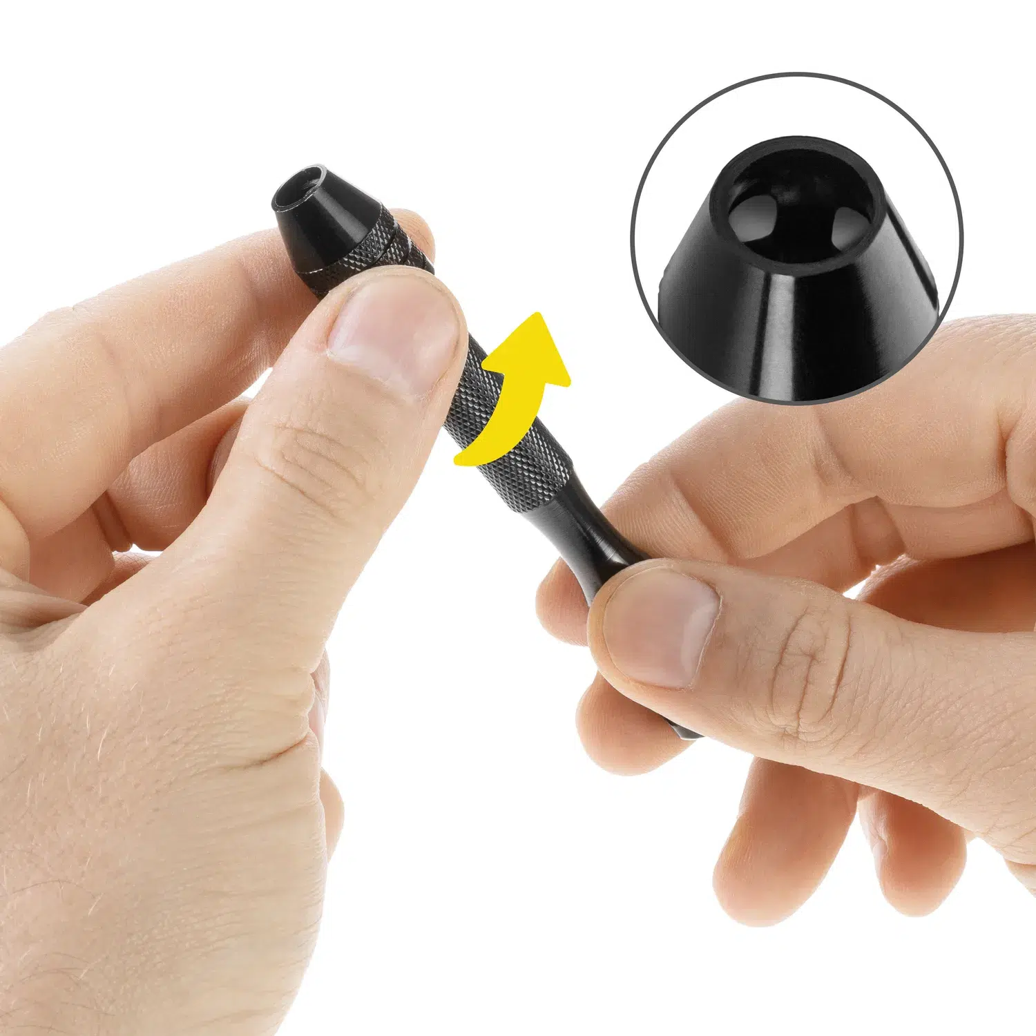 Mini-håndboremaskinen er fremstillet af letvægtsaluminium og ligger perfekt i hånden takket være den ergonomiske form med gribering. Et specielt riflet skridsikkert greb garanterer et sikkert greb med maksimal kraftoverførsel samtidig, så selv børn kan arbejde ubesværet med værktøjet. Indsættelsen af præcisionsboret sker bogstaveligt talt i løbet af et øjeblik. En enkelt omgang er nok, og så slipper den hurtigvirkende borepatron for at indsætte eller skifte boret.