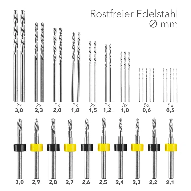 - Inklusive 25 x “HSS-præcisionsbor” (højhastighedsstål) i størrelserne: 0,5 mm / 0,6 mm / 1,0 mm / 1,2 mm / 1,5 mm / 1,8 mm / 2,0 mm / 2,3 mm / 3,0 mm