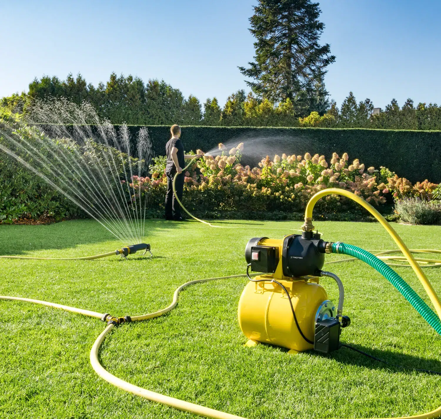 Om sommeren har den hjemlige have brug for vand – gerne ofte og regelmæssigt. Husvandværket TGP 1025 E kan desuden tilsluttes med den praktiske universaltilslutning, udover husvandforsyningen, på alle handelsmæssige havevandingsanlæg. Fra starten bruges haveslangen og vandkanden som manuel vanding til planter og buske, senere med fuldautomatisk have- og græsvanding med støtte fra sprinkler systemer og plænevandere. Enheden er også egnet til arbejde med højtryksrensere, for eksempel til rensning af terrassen eller til bilplejen, da den stærke pumpe TGP 1025 E med 1.000 watt pumper frit brugsvand pr. tastetryk.
