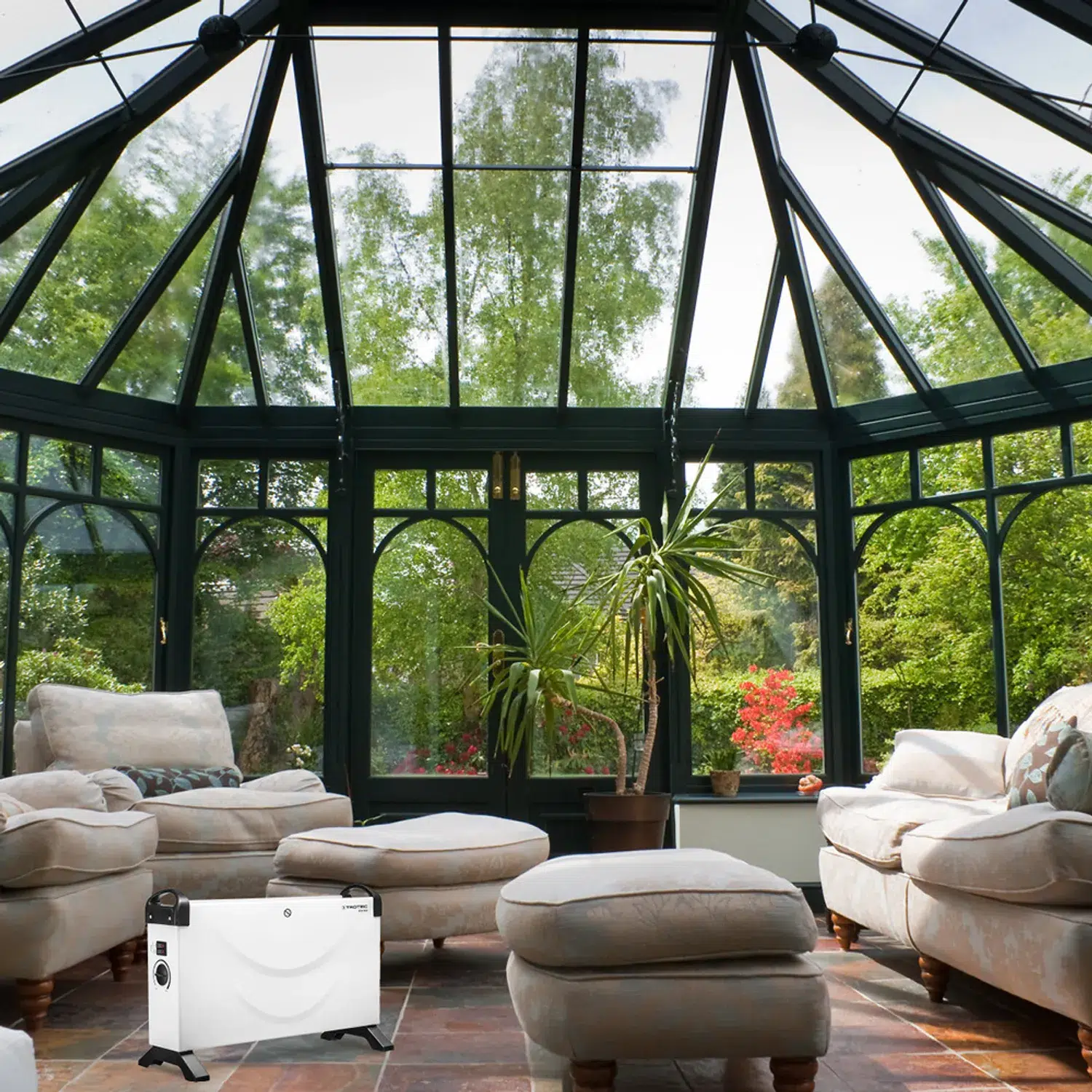 En integreret termostat sikrer for en konstant varmluftstrøm og regulerer automatisk rumtemperaturen: Når den indstillede værdi er nået, kobler varmekonvektoren fra, og når temperaturen kommer under værdien, tænder den igen automatisk. Dette er ikke alene energieffektivt, men besparer også penge! En ekstra sikkerhedstermostat beskytter desuden det kompakte apparat mod overophedning.