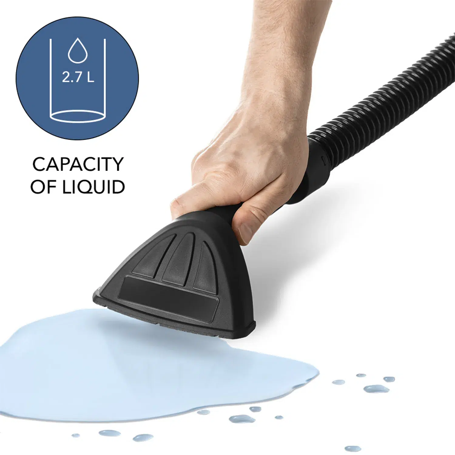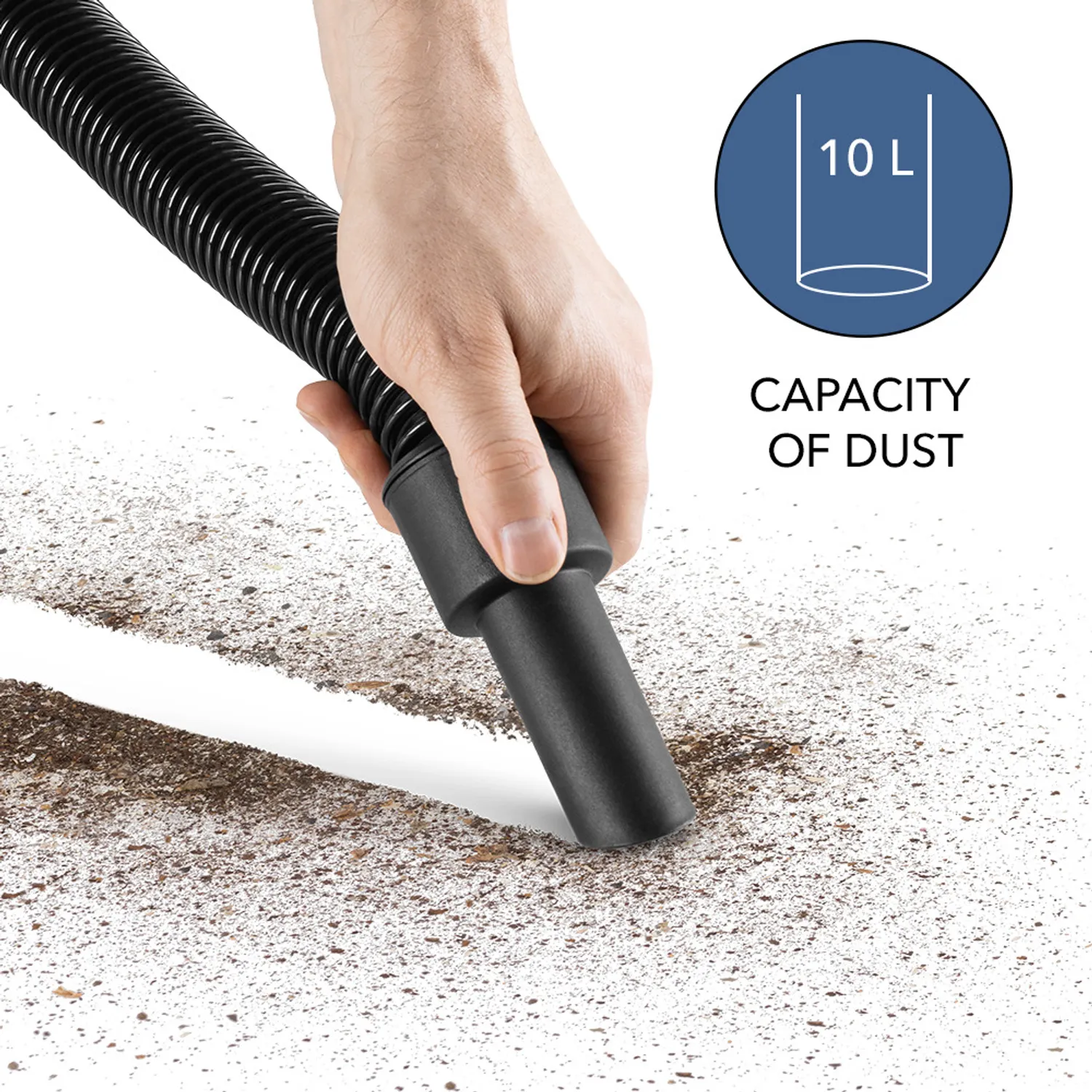 Op til 10 liter tørt snavs eller 2,7 liter væske kan suges op i den rengøringsvenlige opsamlingsbeholder. Det integrerede HEPA-støvfilter kan vaskes.