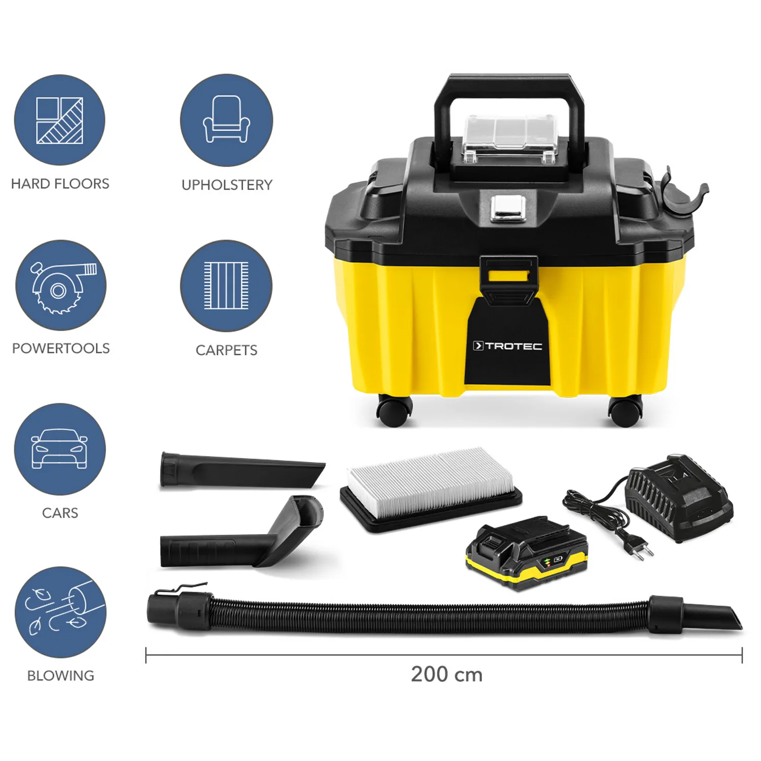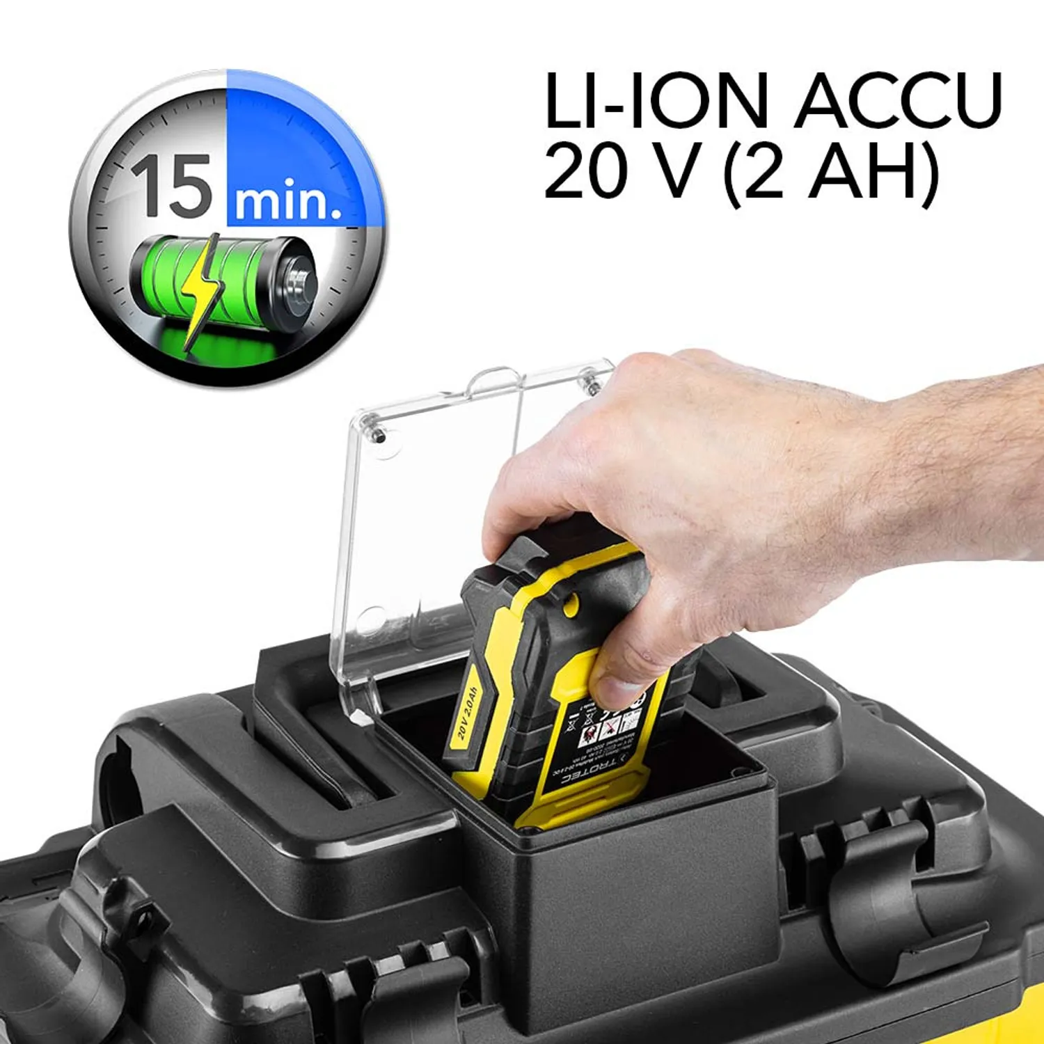 Flere volt, mere kraft – meget enkelt og kompatibelt med en lang række andre Trotec-elværktøjer. Den batteridrevne støvsuger VC 15-20V får den nødvendige energi til sin konstant høje sugeevne fra et 20 V premium genopladeligt batteri med avanceret NMC-teknologi. 20 V 2Ah Flexpower-multibatteriet garanterer fuld effekt lige til det sidste – uden at ydeevnen falder, når batteriet fortsat aflades. Sammenlignet med standardbatterier med kun 16 volt eller 1,5 Ah giver 20 V Flexpower-batteriet med sine 2 Ah op til 33 % længere driftstid. Og når batteriet er afladet, kan du lade det helt op på bare en time med den hurtigoplader, der følger med i leveringen. For endnu mere kraft og udholdenhed kan den batteridrevne støvsuger også udstyres med Flexpower-multibatteriet på 20V-4Ah. Det kan nemt bestilles som tilbehør.