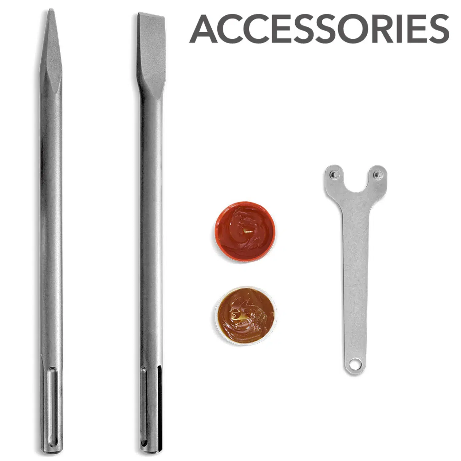 1 x gaffelnøgleNødvendig for at åbne fedtpåfyldningsåbningen- 1x SDS-fladmejsel (18 x 350 mm) af blødt stål 40Cr Velegnet til almindeligt nedrivningsarbejde, til at fjerne puds og fliser og til at arbejde på mursten eller beton