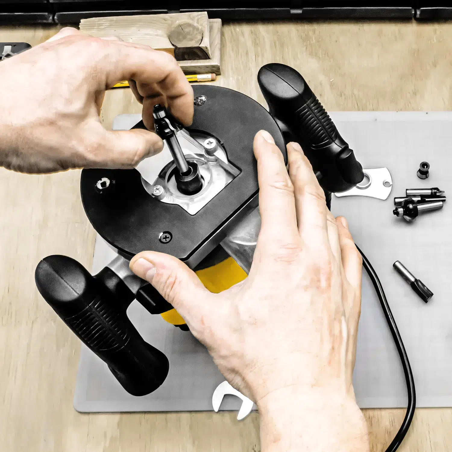 - Quick-release-greb til låsning af fræsedybde