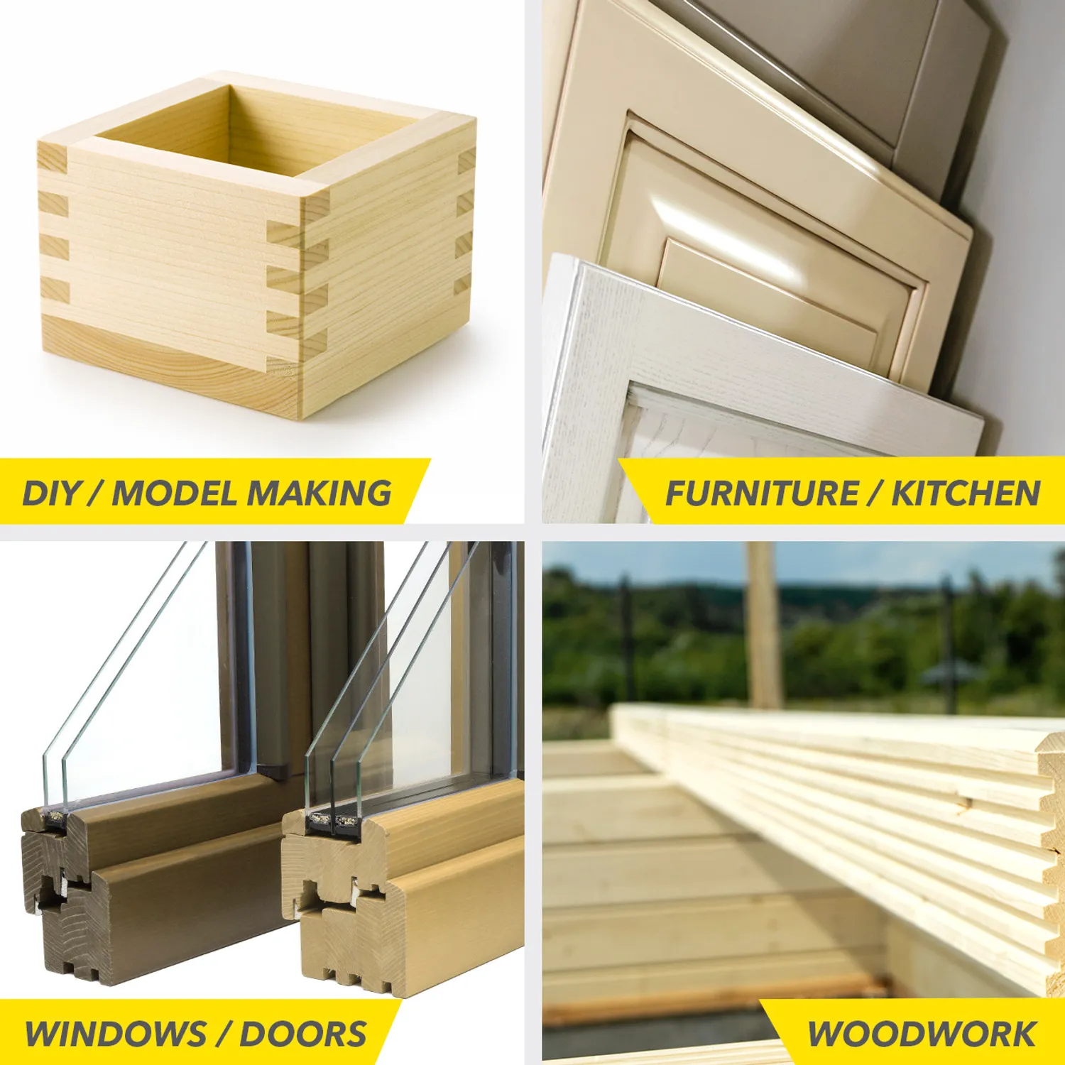 - Fræsning af alle typer træ (massivt træ, krydsfiner), plast og letvægtsmaterialer (f.eks. gipsplader og fiberplader)