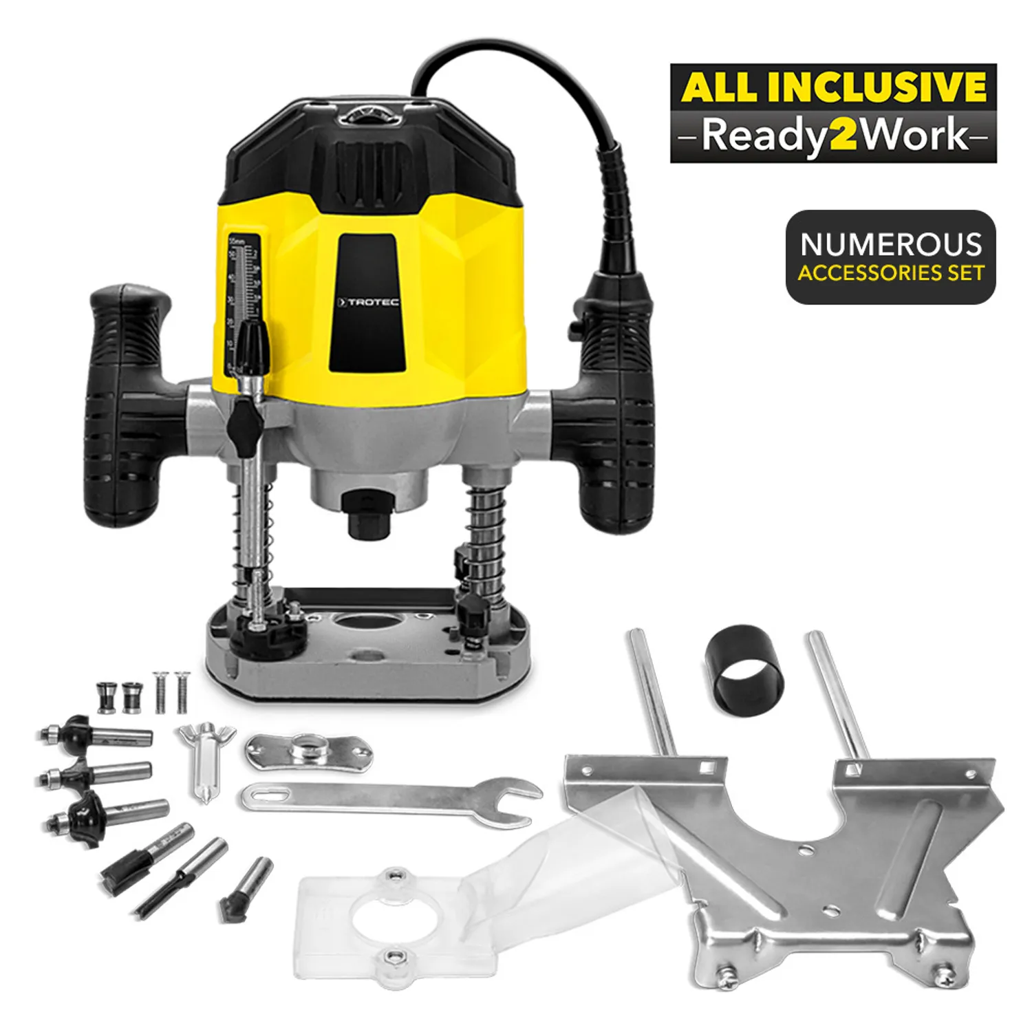 - Inkl. parallelanslag, dybdestop, skruenøgle, adapter til støvudsugning, støvslange, kompasspidssæt