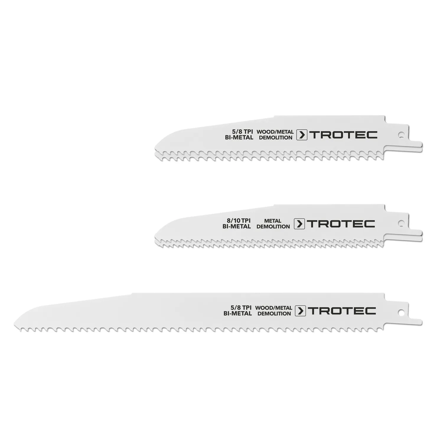 For at sikre, at den frem- og tilbagegående sav kan yde sit fulde potentiale, og at skæreresultatet er i top, bør du bruge en passende, skarp savklinge af høj kvalitet fra Trotec til hvert savarbejde. Da savklinger bliver sløvere ved hver brug og derfor er sliddele, skal de udskiftes med en ny klinge fra tid til anden. Desuden er det altid muligt, at en savklinge kan gå i stykker, selv med den bedste kvalitetssavklinge. Som du kan se, er der gode grunde til ikke kun at udstyre sig selv med forskellige savklinger til forskellige materialer, men også til at opbygge et lille lager.