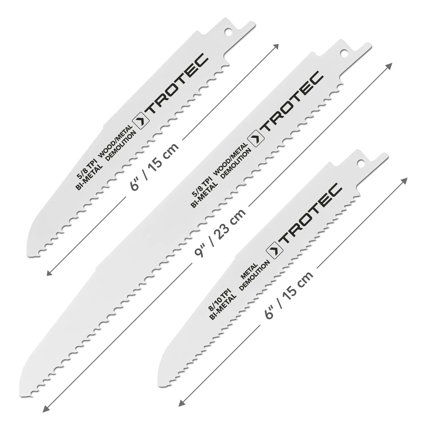 Trotec-stiksavklinger af høj kvalitet fås i et praktisk 5-delt nedrivningssæt til træ og metal. Stiksavsklingerne passer til de to stiksavsmodeller fra Trotec PRCS 10-850 og den batteridrevne stiksav PRCS 10-20V samt til alle i handlen tilgængelige stiksave.