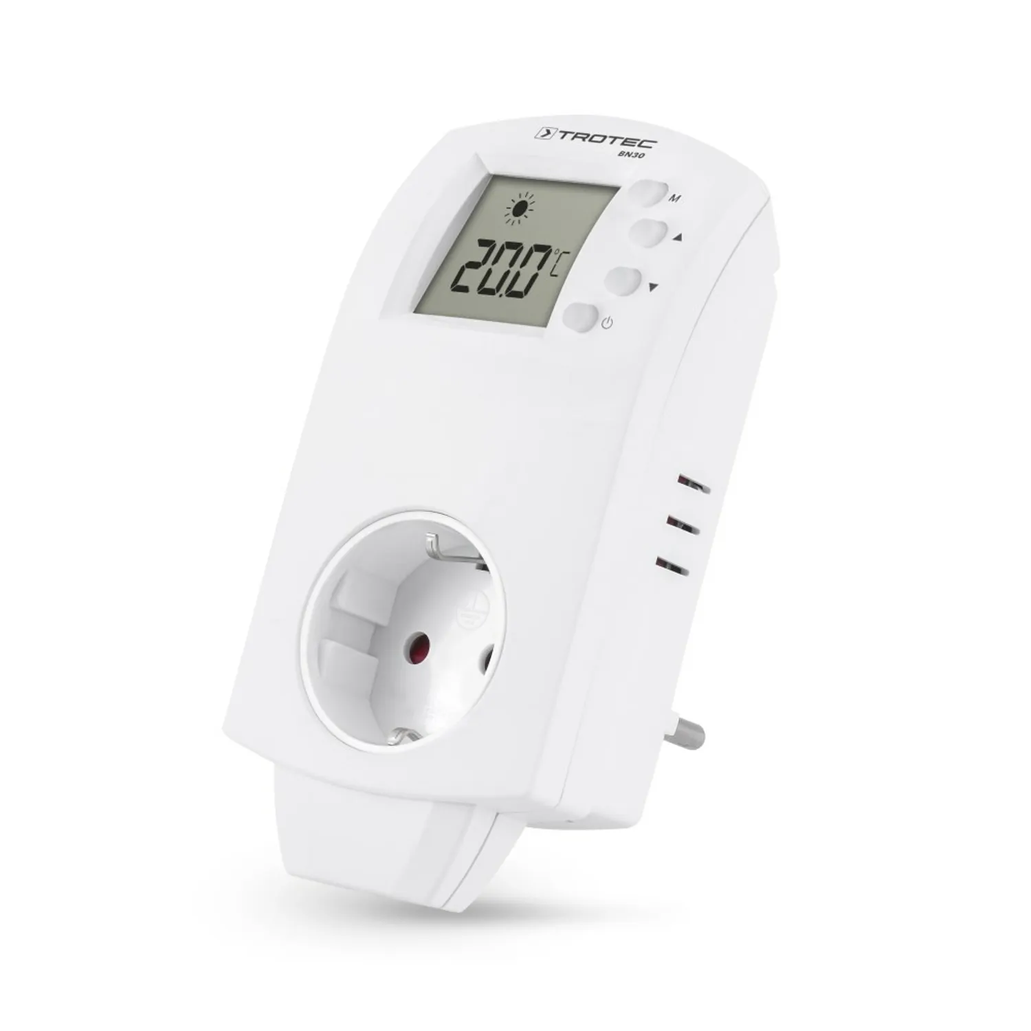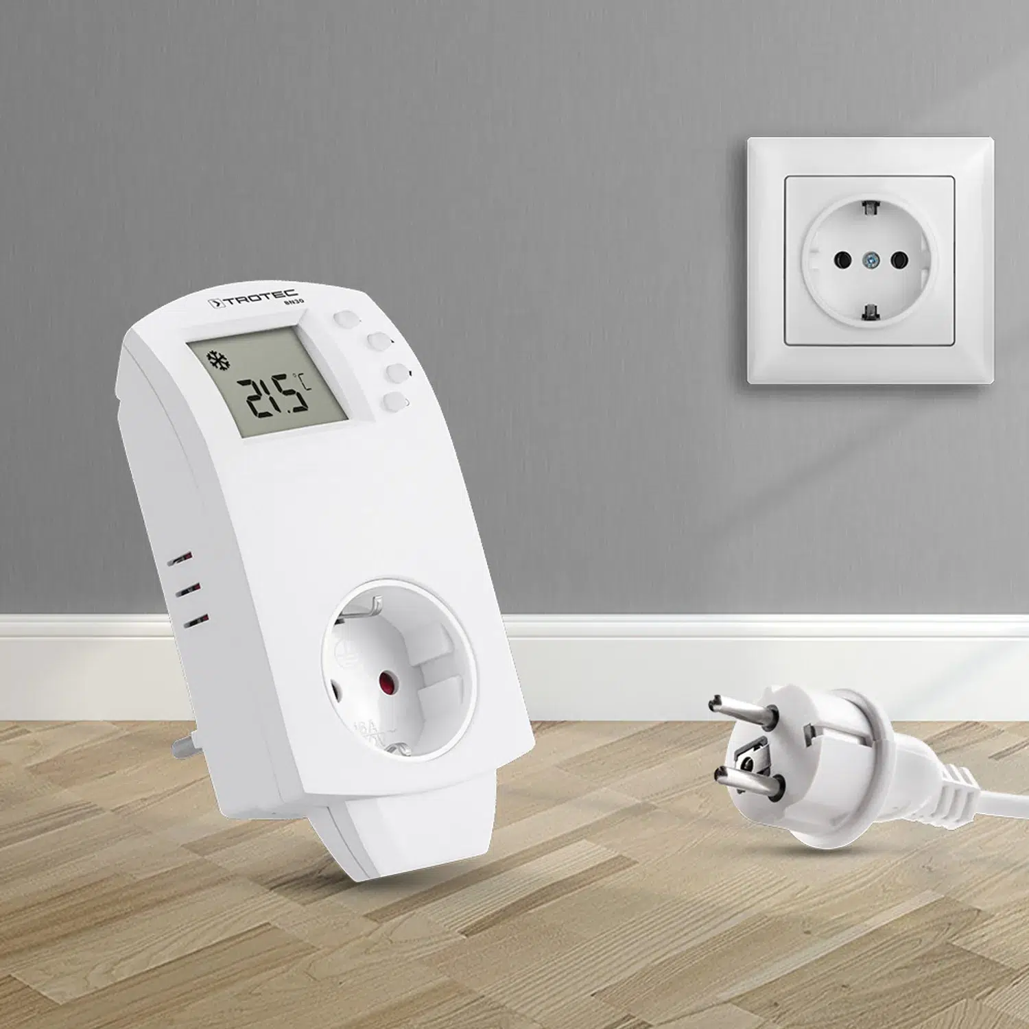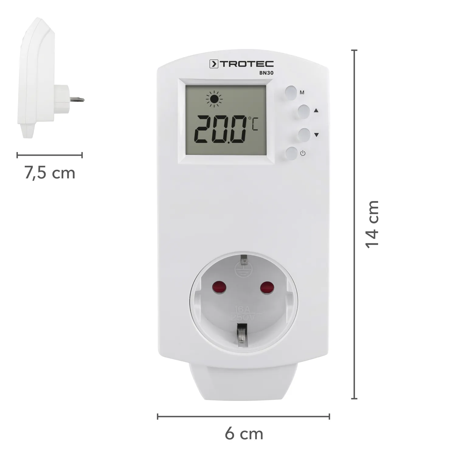 BN30-termostaten muliggør temperaturregulering af varme- og klimaanlæg temperaturregulering af varme- og klimaanlæg mellem 5 °C og 30 °C. For at gøre dette skal stikkontakttermostaten blot placeres mellem varme- eller klimaanlægget og stikkontakten. klimaanlægget og stikkontakten, og den ønskede temperatur indstilles. indstilles. Ved hjælp af sine integrerede sensorer måler enheden den faktiske faktiske værdi af rumtemperaturen og regulerer opvarmningen eller klimaanlægget i henhold til det ønskede setpunkt.