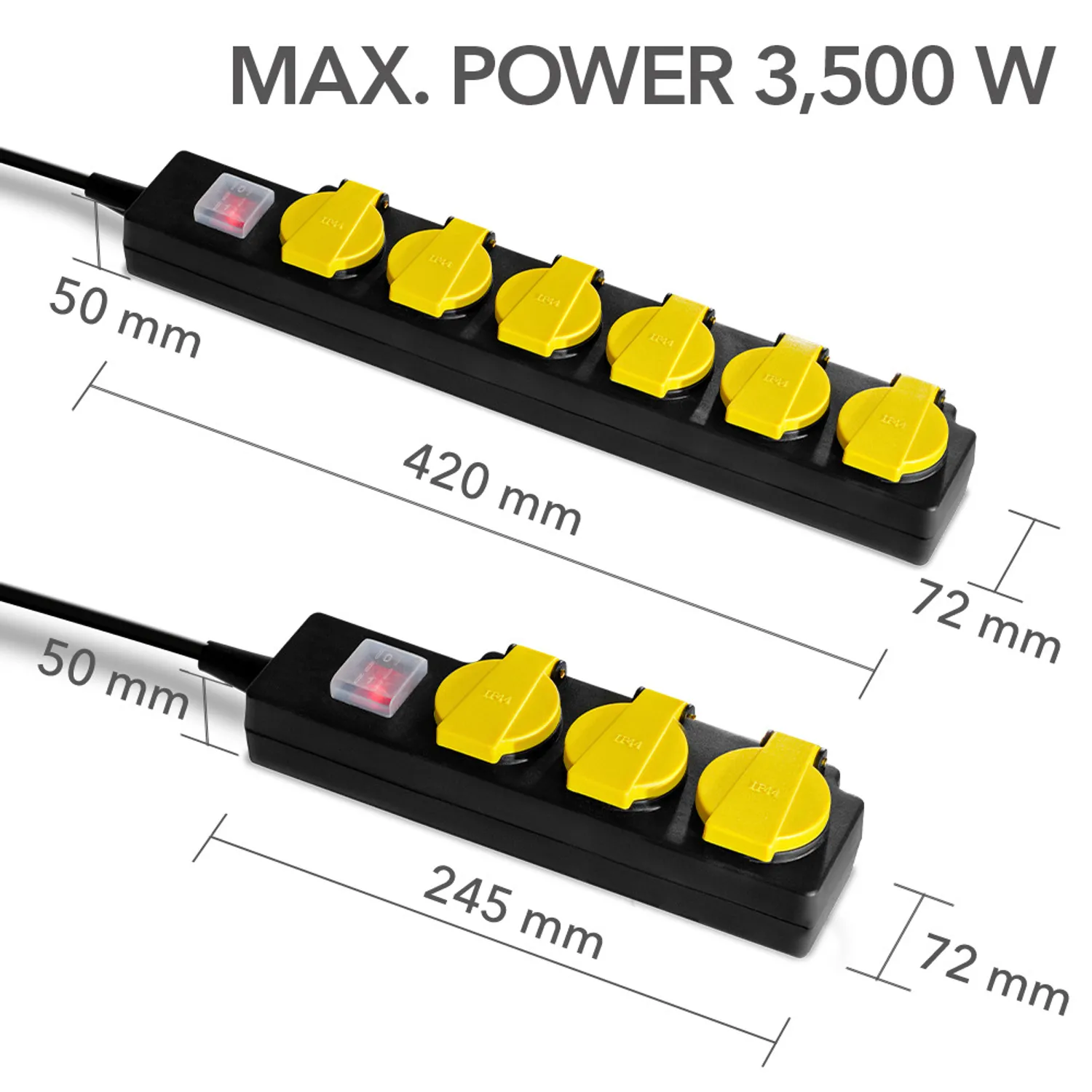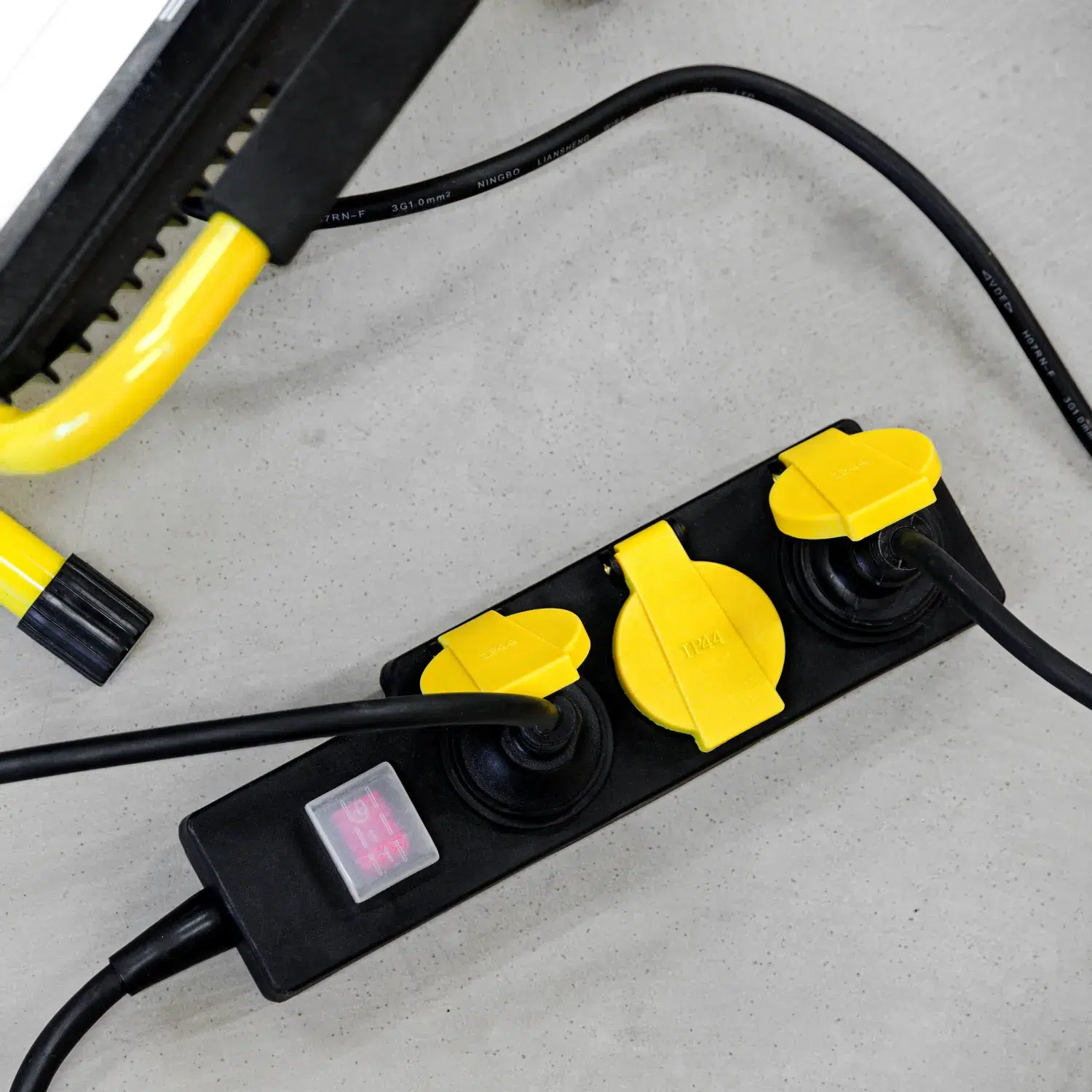 Selvlukkende hængslede dæksler med integrerede gummitætningslæber over stikkontakterne stikkontakter giver pålidelig beskyttelse mod indtrængen af snavs med en partikelstørrelse indtrængen af snavs med en partikelstørrelse på mere end en millimeter, fugt og vandsprøjt. Vippekontakten til at tænde og slukke har en vandtæt beskyttelseshætte. Det 2 meter lange netkabel i kabel i et let gummislangedesign er særligt modstandsdygtigt over for trækbelastninger og mekanisk stress.