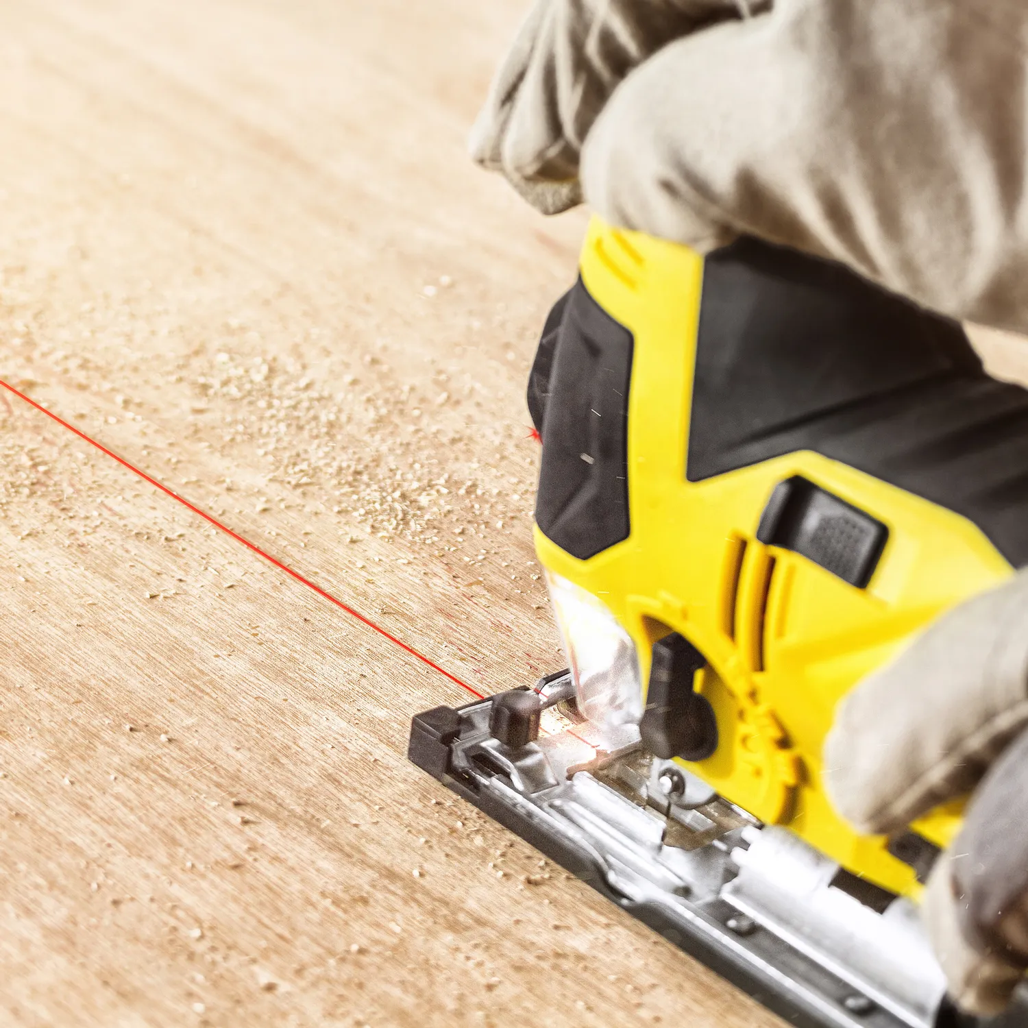 Derudover er PJSS 13-230V udstyret med et innovativ laser-føringslys, som betjenes seperat. Laseren projicere en rød linje på arbejdsstykket og viser præcist snitretninger, hvor den frithåndterlige føring af saven lettes langs en rids. Afvigelser af snit linjer genkendes straks og korrigeres.